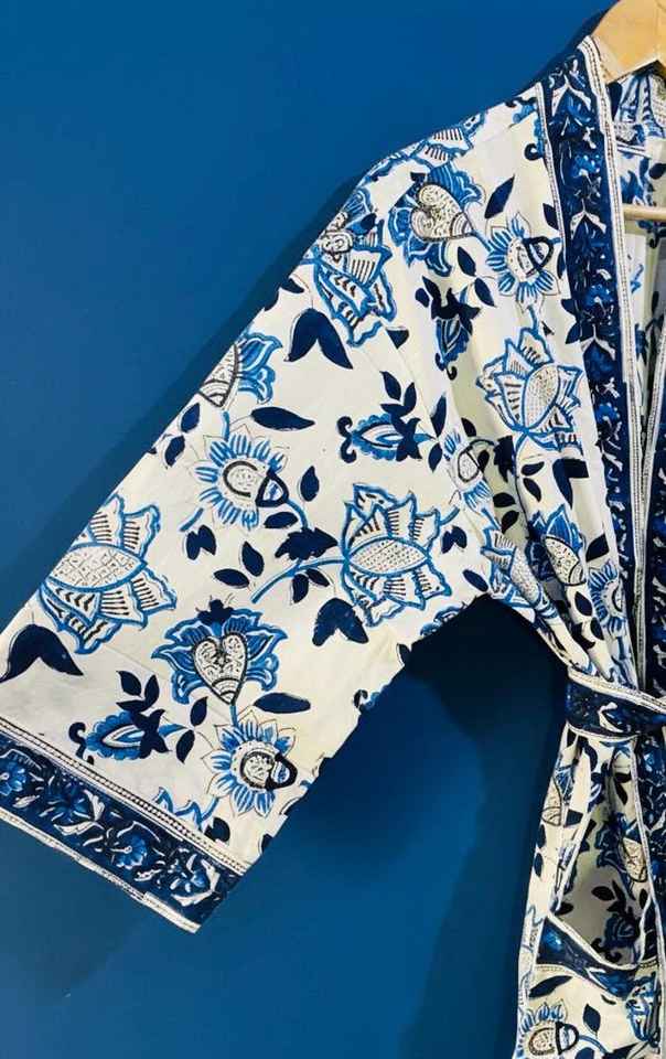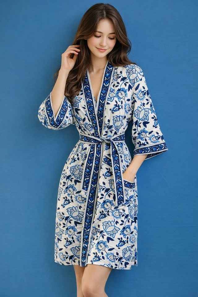 ชุดกิโมโนผ้าฝ้ายพิมพ์ลายบล็อกสีน้ำเงินสำหรับผู้หญิง ชุดลำลองลายดอกไม้ สวมใส่สบาย