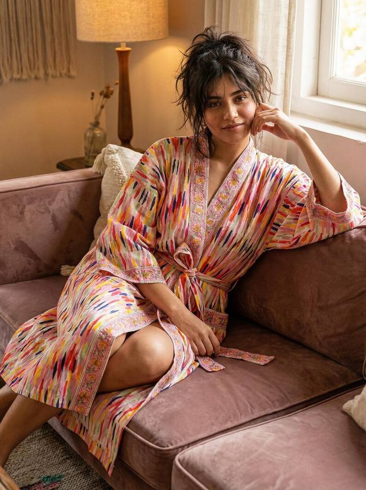 ชุดคลุมกิโมโนผ้าฝ้ายพิมพ์ลายบล็อกสีสันสดใสสำหรับผู้หญิง ชุดคลุมอินเดีย น้ำหนักเบา ชุดคลุมอาบน้ำ