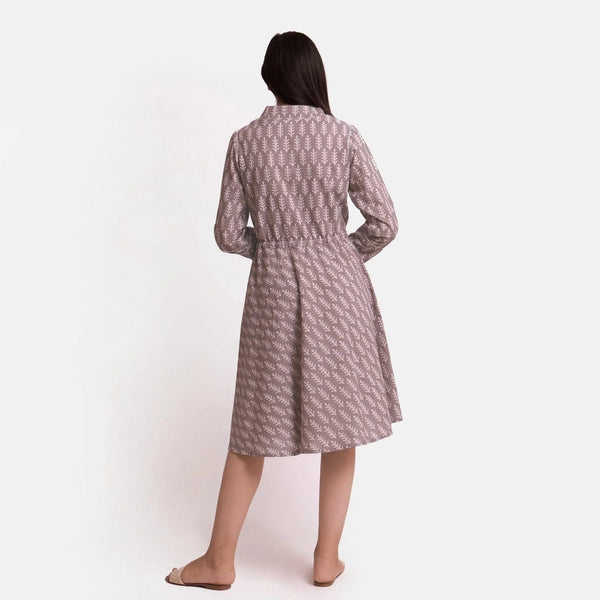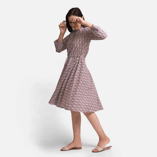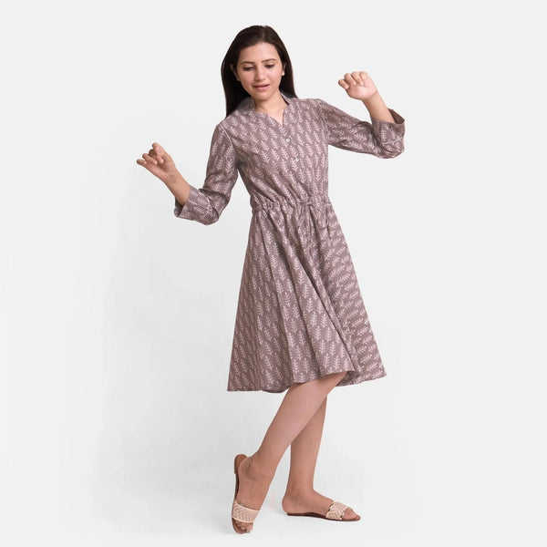 เดรสผ้าฝ้ายแขนยาวถึงเข่าสำหรับผู้หญิงชุดเดรสลำลองคอกลมพิมพ์ลาย