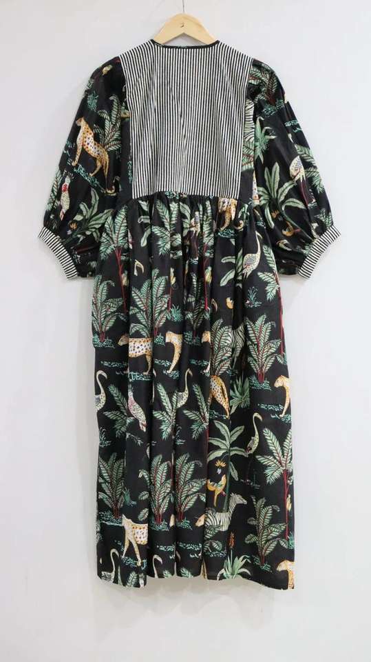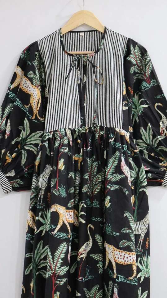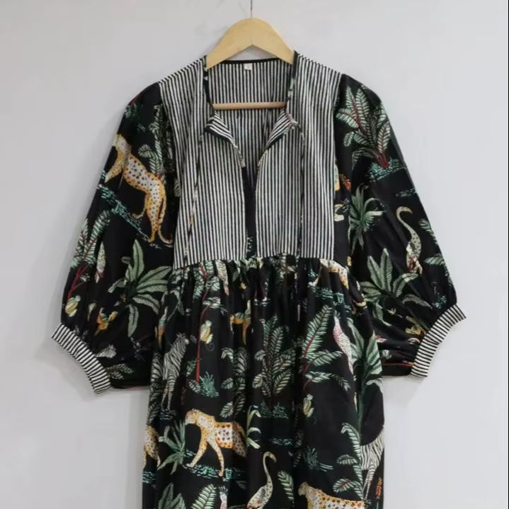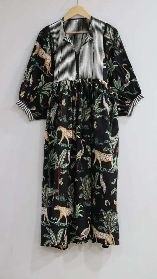 เดรสผ้าฝ้ายพิมพ์ลายบล็อกมือสไตล์โบฮีเมียน คีร่า ทรงมิดิ สำหรับฤดูใบไม้ผลิ