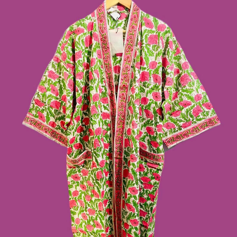 ชุดกิโมโนผ้าฝ้ายพิมพ์ลายดอกไม้สีเขียวชมพูสำหรับผู้หญิง เสื้อคลุมอินเดีย ชุดคลุมน้ำหนักเบา ชุดคลุมลำลอง ไซส์ใหญ่