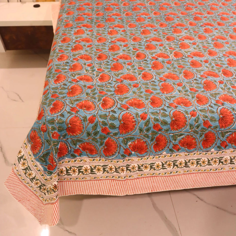 Hand Block Print Jaipuri Quilt Bedsheet Reversible and 100% Cotton Quilts Beautiful Big Red Flower Design Pattern for Bed Decor