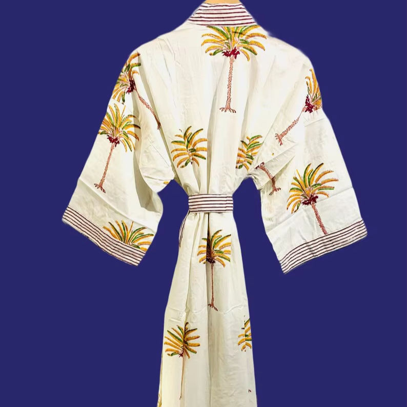 ชุดคลุมกิโมโนผ้าฝ้ายพิมพ์ลายต้นปาล์มด้วยมือ 100% ผ้าฝ้าย ชุดคลุมอาบน้ำผู้หญิงสไตล์อินเดีย ชุดคลุมลำลองน้ำหนักเบา ไซส์ใหญ่