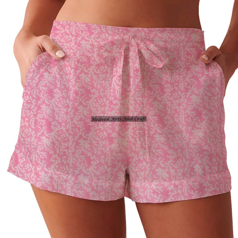 กางเกงขาสั้นพิมพ์ลายด้วยมือสำหรับผู้หญิง เสื้อผ้าฝ้ายเนื้อนุ่ม กางเกงนอนขาสั้น ระบายอากาศได้ดี ผ้าฝ้ายอินเดีย พิมพ์ลายด้วยมือ