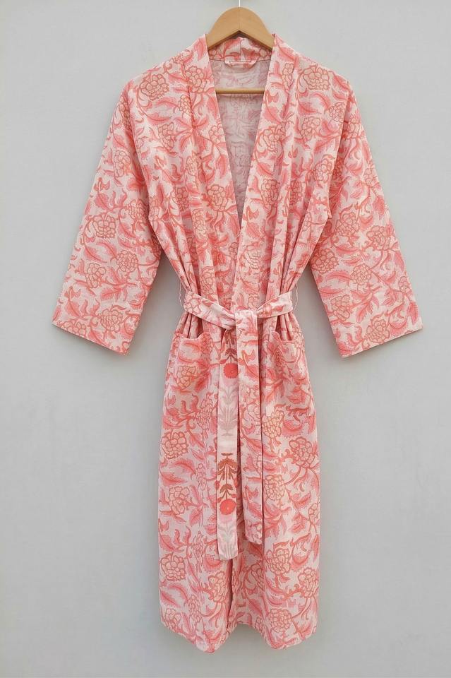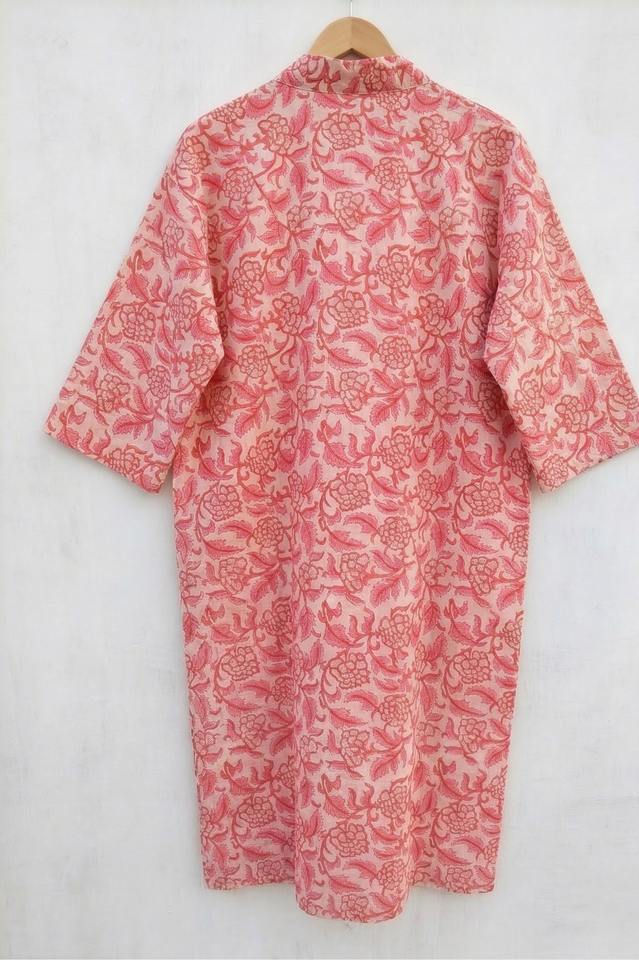 ชุดนอนกิโมโนผ้าฝ้ายพิมพ์ลายด้วยมือสำหรับผู้หญิง สไตล์โบฮีเมียน ชุดชายหาด ชุดฤดูร้อน คอตั้ง เรียบลื่น