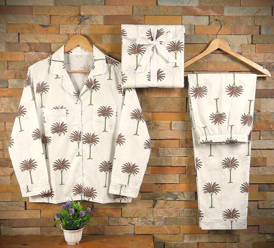 ชุดนอนผ้าฝ้ายพิมพ์ลายต้นปาล์มด้วยมือ ปักลายดอกไม้ด้วยเครื่องจักร แขนยาว สำหรับผู้หญิง ฤดูใบไม้ผลิ/ฤดูร้อน มีกระเป๋า แบบสองด้าน