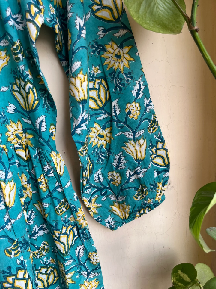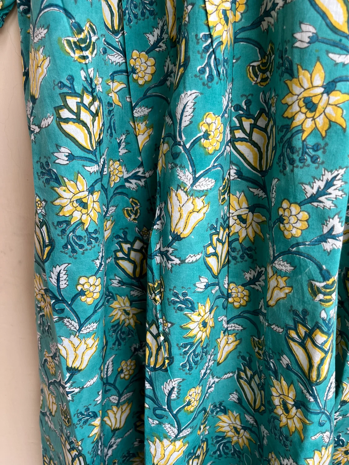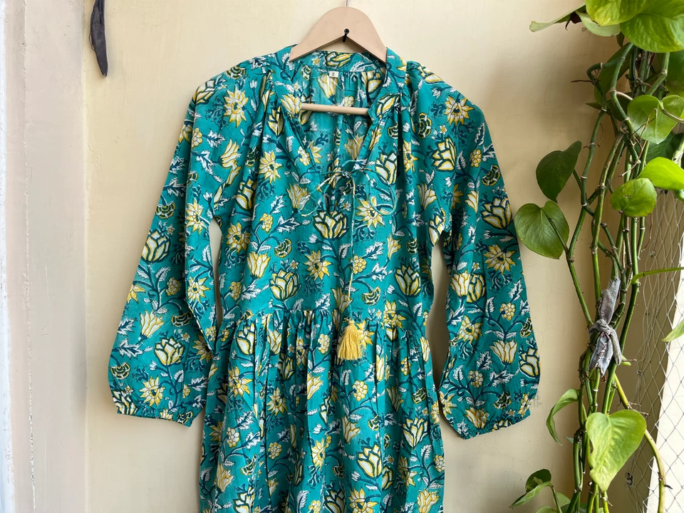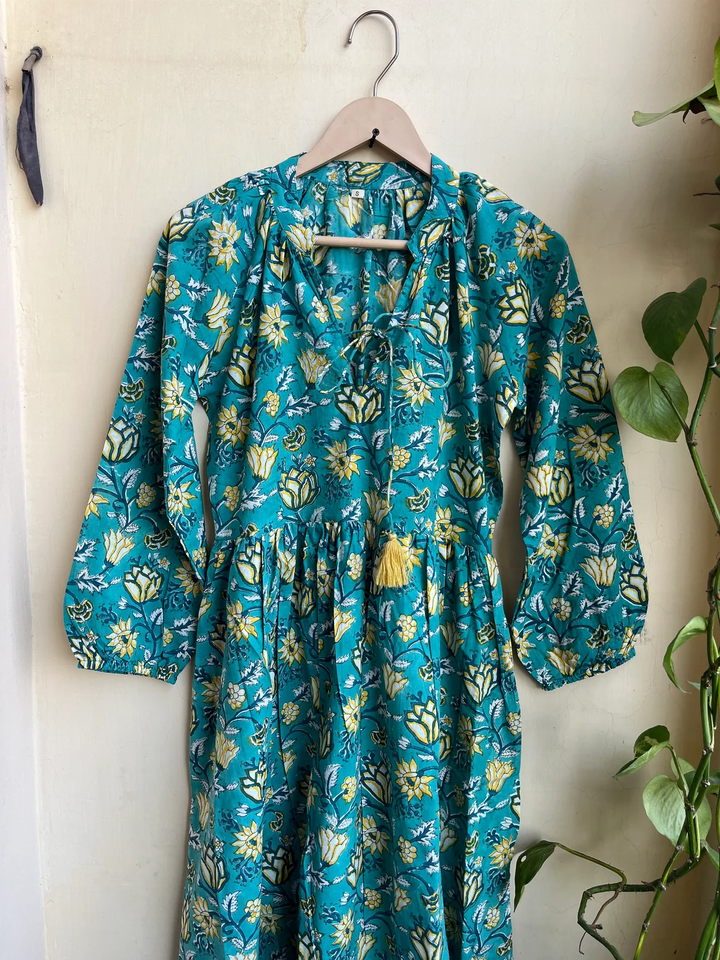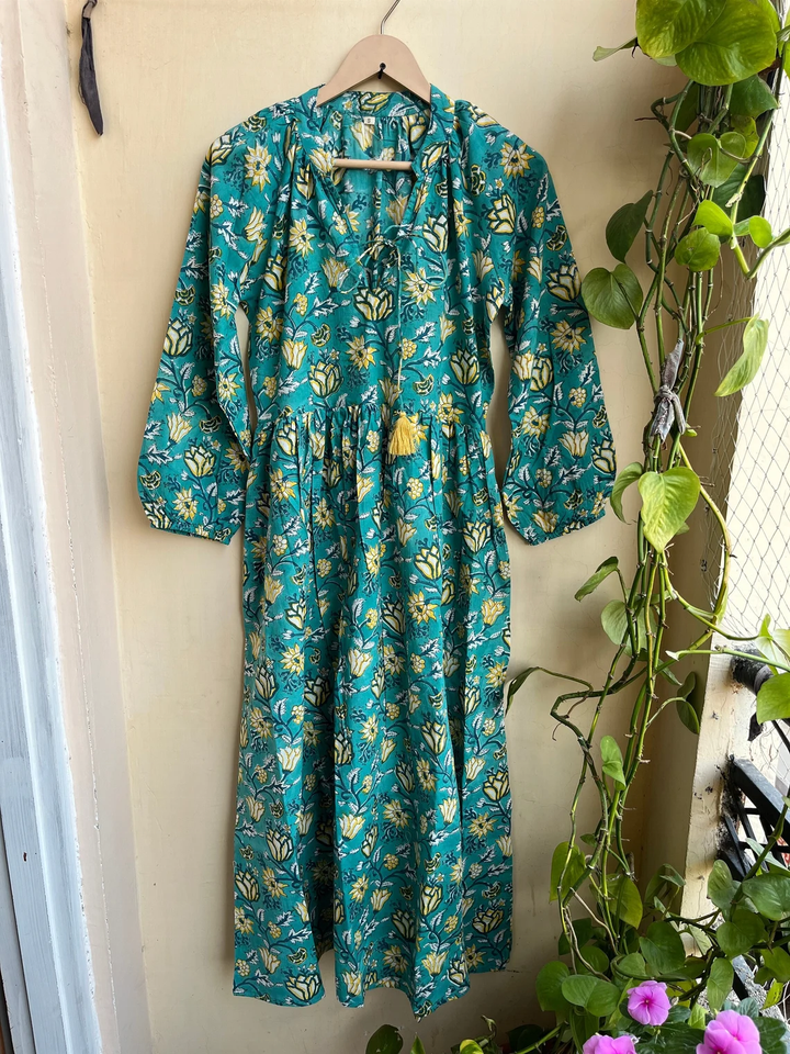 ชุดเดรสอินเดียผ้าฝ้ายพิมพ์ลายด้วยมือ 100% คอวี แขนยาว ลายดอกไม้ สวมใส่สบายๆ ชุดเดรสยาวสำหรับผู้หญิง