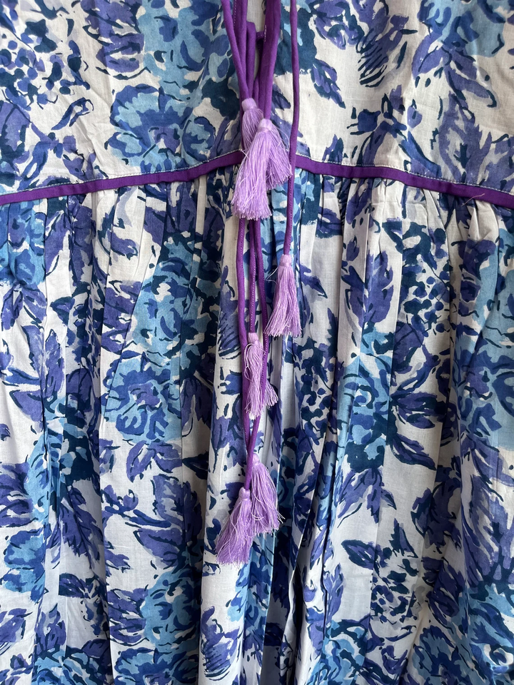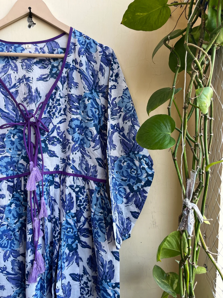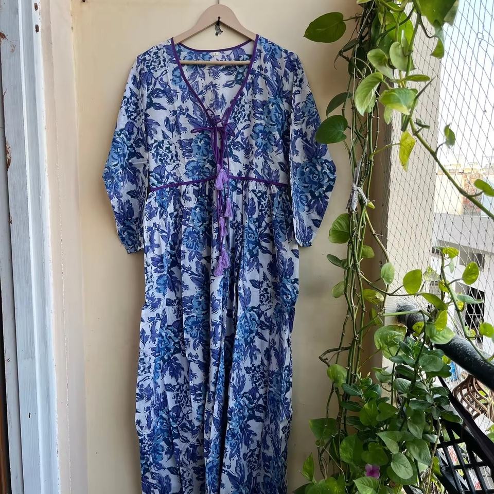 เดรสยาวผ้าฝ้ายพิมพ์ลายด้วยมือ 100% พร้อมงานปักและพู่ห้อย สไตล์ลำลองลายดอกไม้ ชุดยาวแบบอินเดีย ราคาขายส่ง