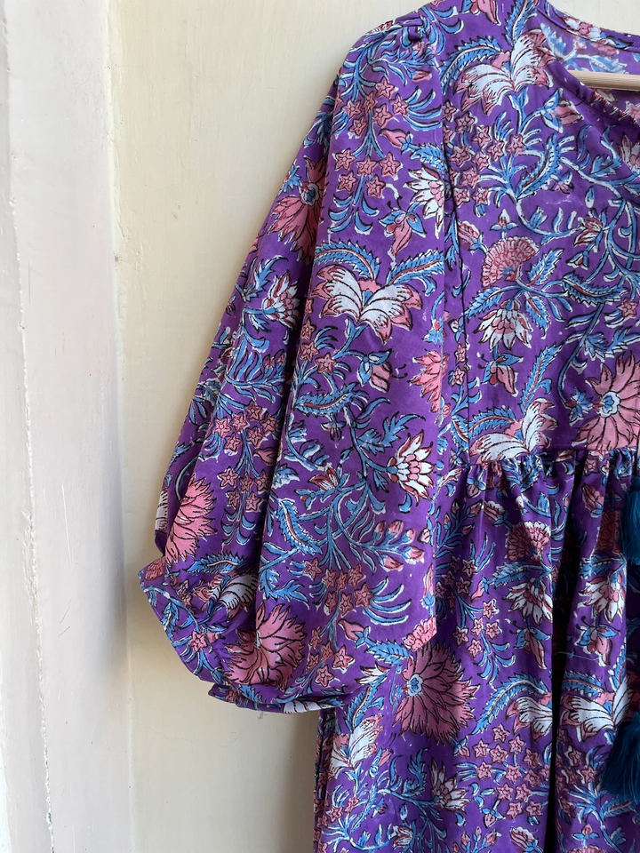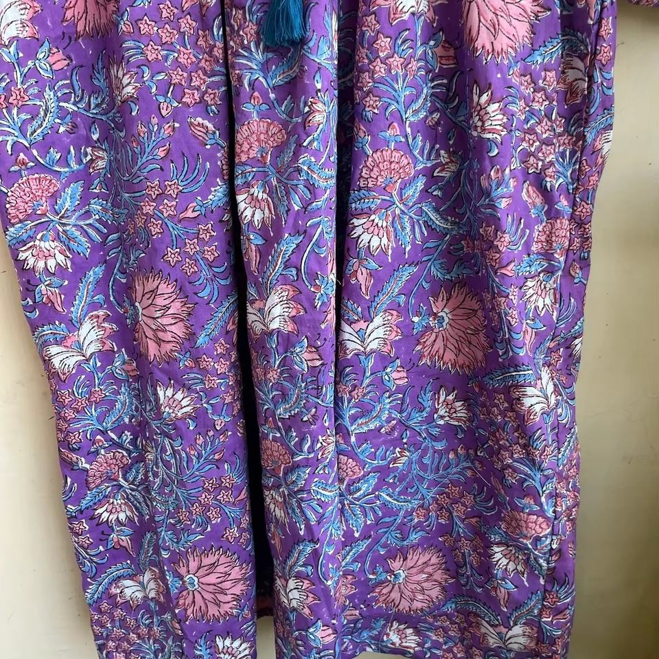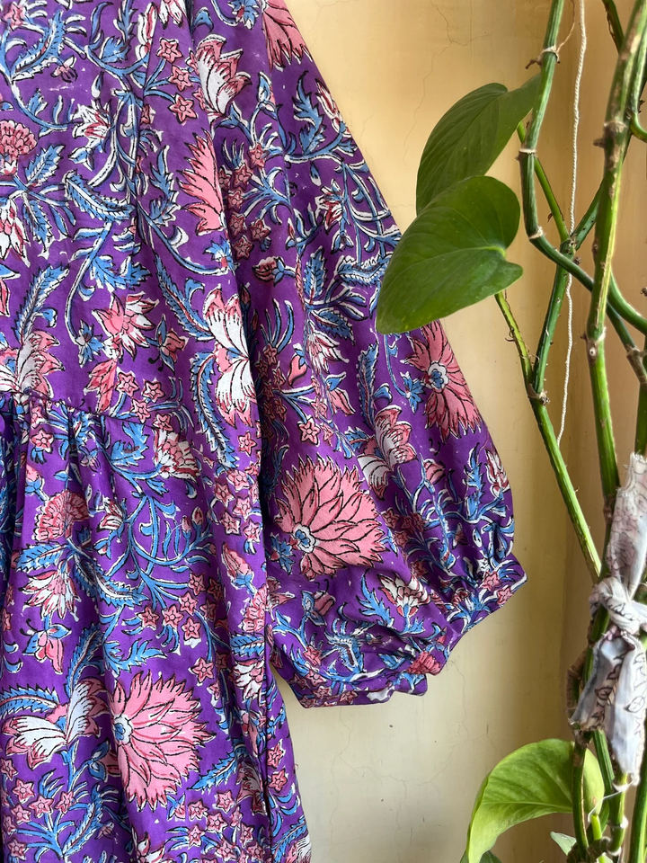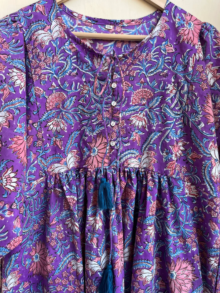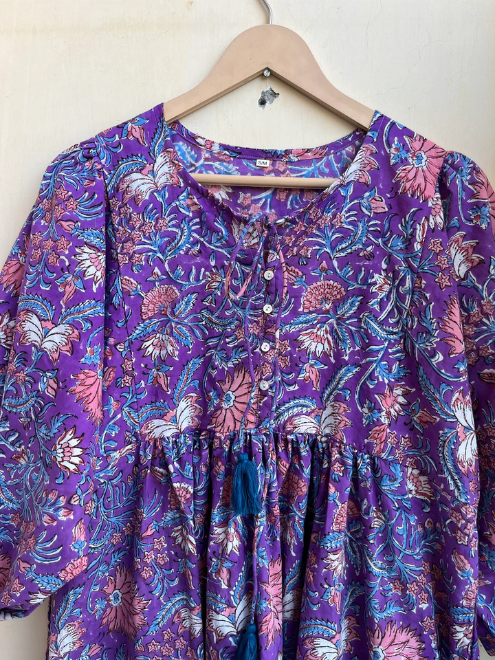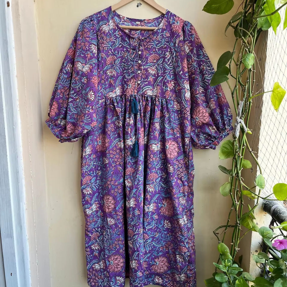 Hand Block Printed 100% Cotton Maxi Dress for Women Round Neck Long Sleeve Floral Pattern Indian Tunics Casual Summer Dress