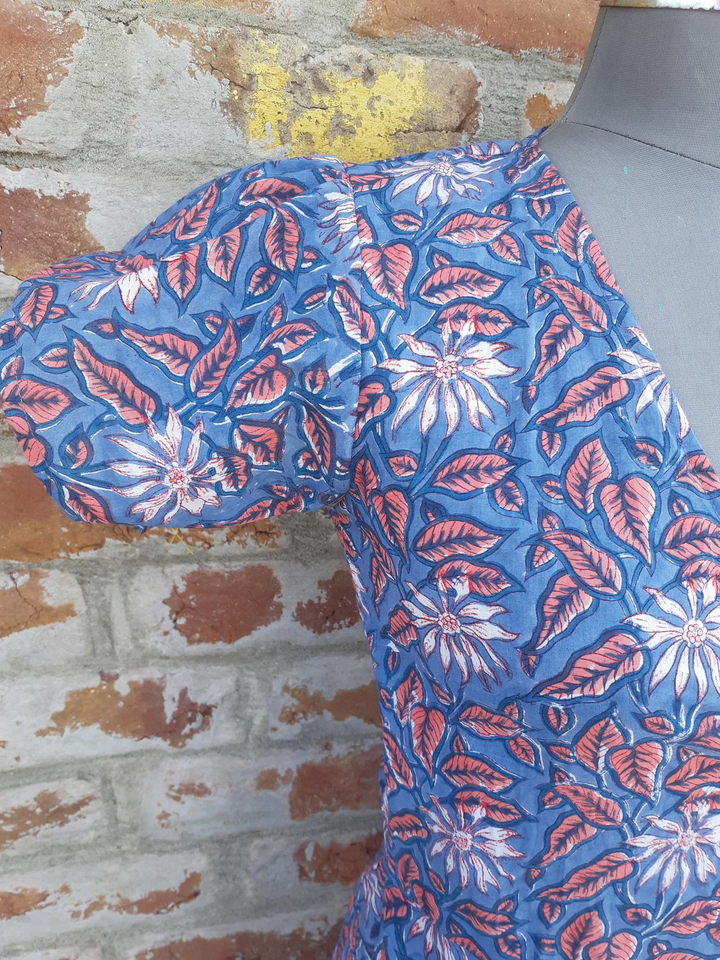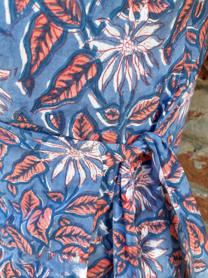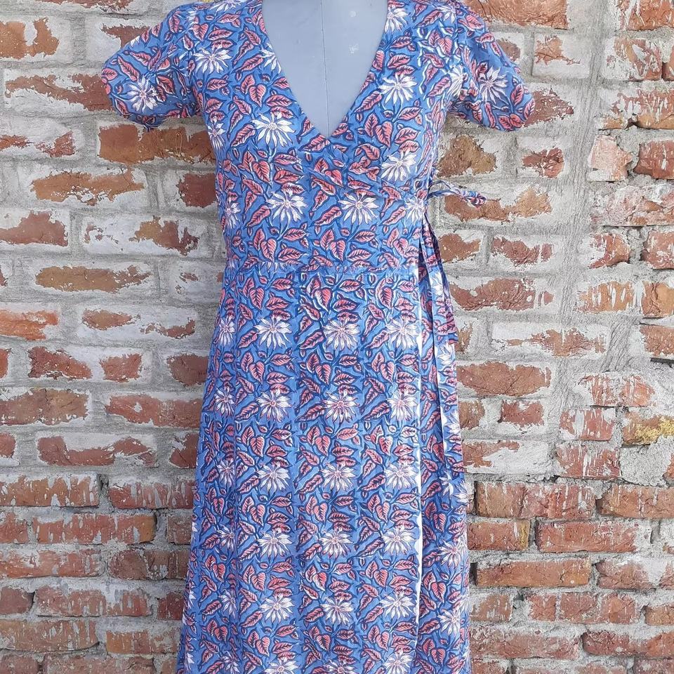 เดรสผ้าฝ้ายพิมพ์ลายด้วยมือ 100% ลายดอกไม้สไตล์โบฮีเมียนเก๋ไก๋ แรงบันดาลใจจากวัฒนธรรมชนเผ่า พร้อมลายปักสไตล์ชนเผ่า
