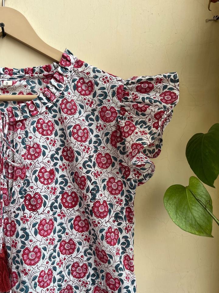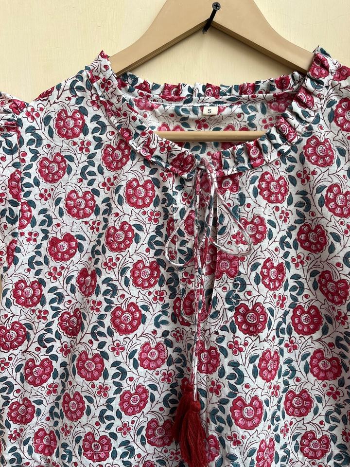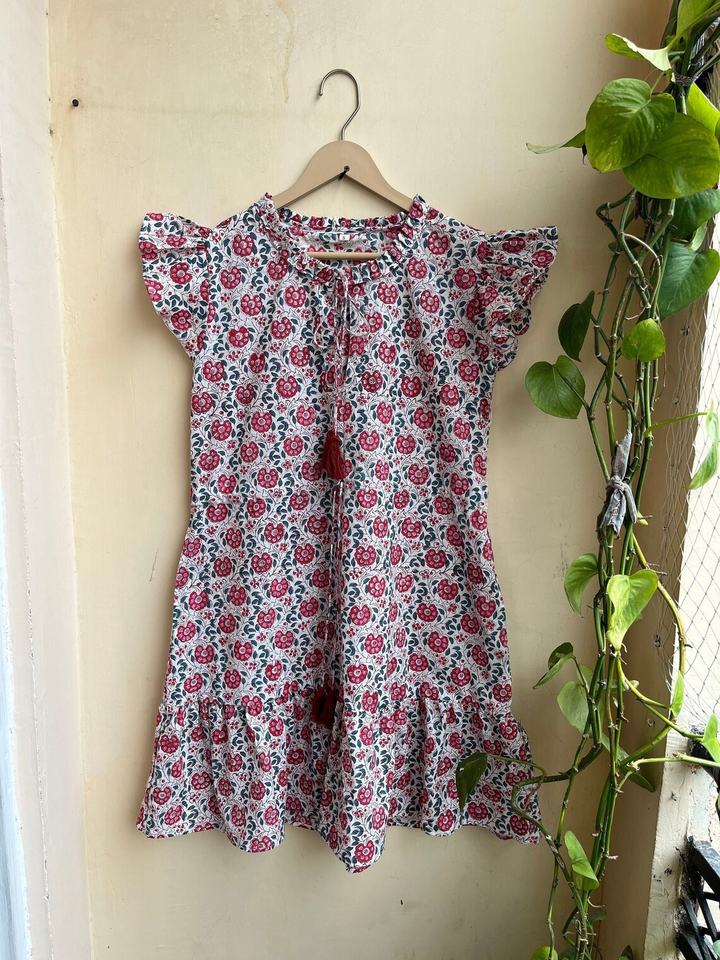 เดรสผ้าฝ้ายพิมพ์ลายดอกโบโฮแบบแฮนด์บล็อกพิมพ์ เดรสสั้นแบบผูกคอสำหรับผู้หญิง สไตล์ลำลองสำหรับฤดูร้อน ผ้าฝ้าย 100%
