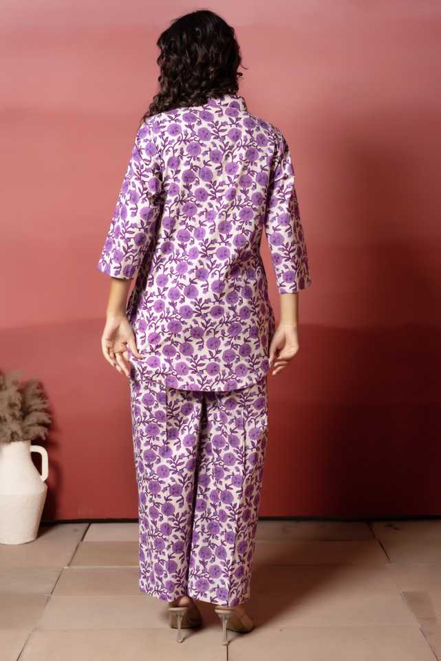 ชุดเซ็ตผ้าฝ้ายพิมพ์ลายด้วยมือสำหรับผู้หญิง สีม่วงลายดอกไม้ ติดกระดุมด้านหน้า เป็นมิตรกับสิ่งแวดล้อม ทำด้วยมือ เหมาะสำหรับใส่ในชีวิตประจำวัน ใส่สบายๆ ในฤดูร้อน
