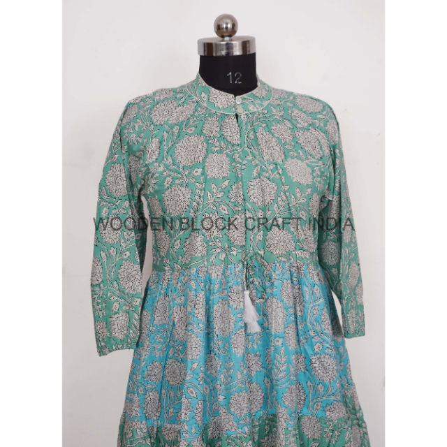 เดรสผ้าฝ้ายพิมพ์ลายแบบบล็อกสำหรับผู้หญิงเสื้อคลุมยาวคลุมเข่ามีพู่ลูกไม้สำหรับงานแต่งงานและงานปาร์ตี้ของอินเดียรอบเอวธรรมชาติ