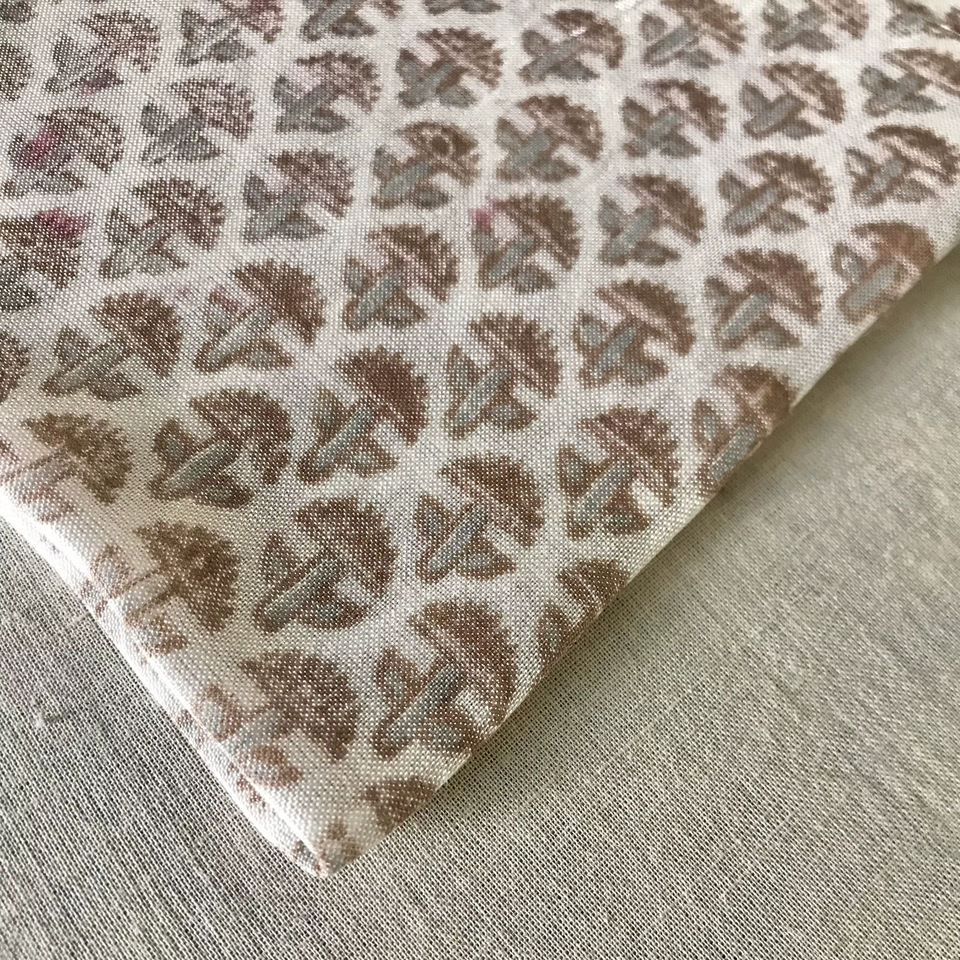 ผ้าฝ้ายพิมพ์ลายด้วยมือ – ลายบูติทั่วผืน | ผ้าทอแบบดั้งเดิมของอินเดียสีน้ำตาลและสีเขียวเซจ