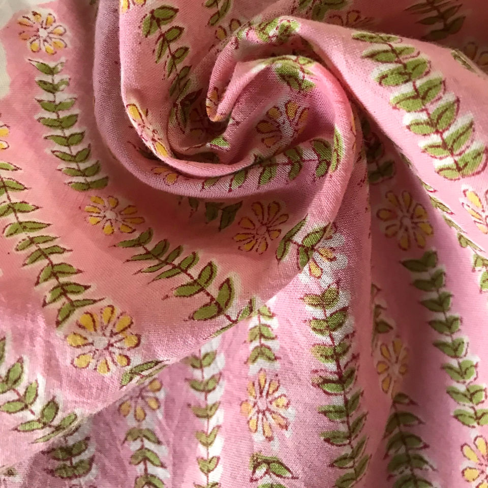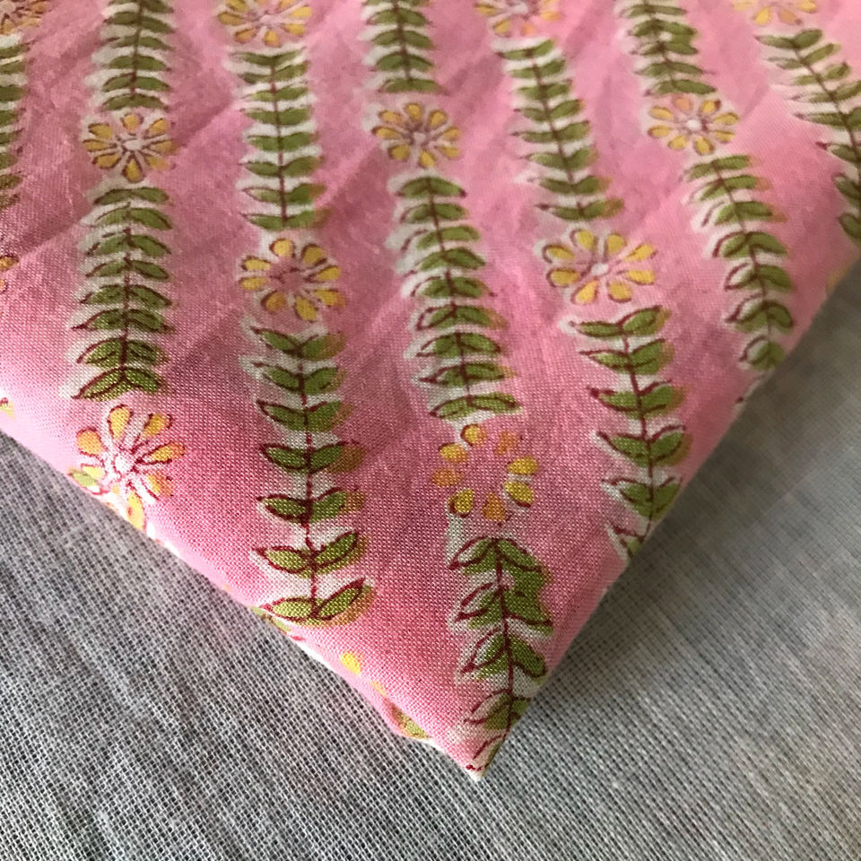 ผ้าฝ้ายพิมพ์ลายด้วยมือ – ลายดอกไม้สีชมพูอ่อนและลายใบไม้แนวทแยง | ผ้าฝ้ายอินเดียขายส่ง