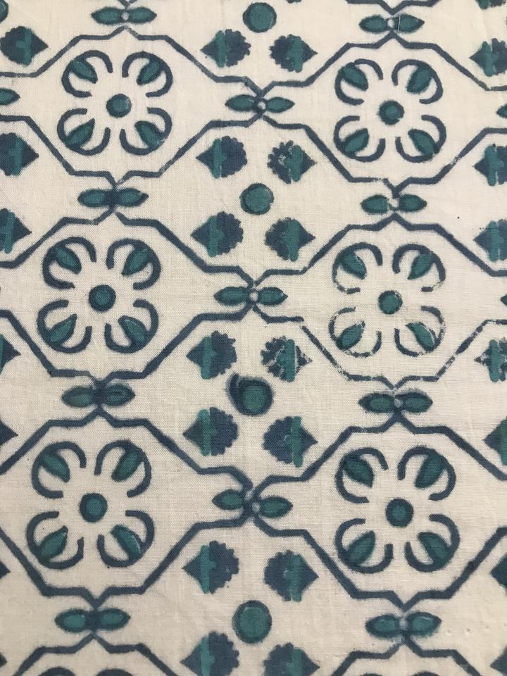 ผ้าฝ้ายพิมพ์ลายด้วยมือ ลายดอกไม้และเรขาคณิต ซ้ำกัน สีเขียวอมฟ้า บนพื้นผ้าสีธรรมชาติ