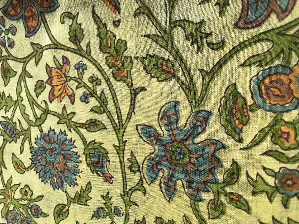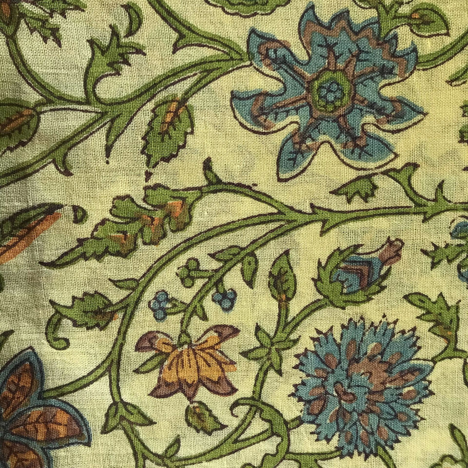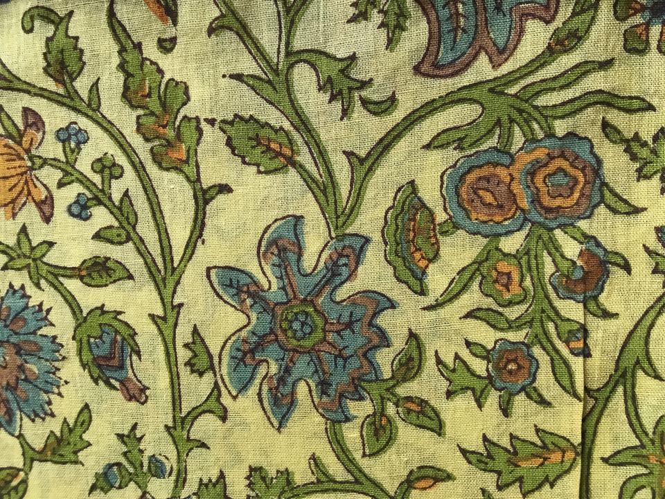 ผ้าฝ้ายพิมพ์ลายด้วยมือ สีเขียวพิสตาชิโออ่อน พื้นสีเขียวอ่อน ลายดอกไม้หลากสี | ลายพิมพ์แบบอินเดียดั้งเดิม