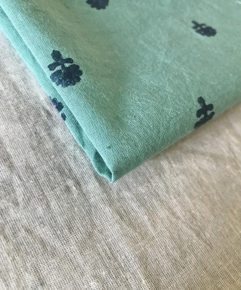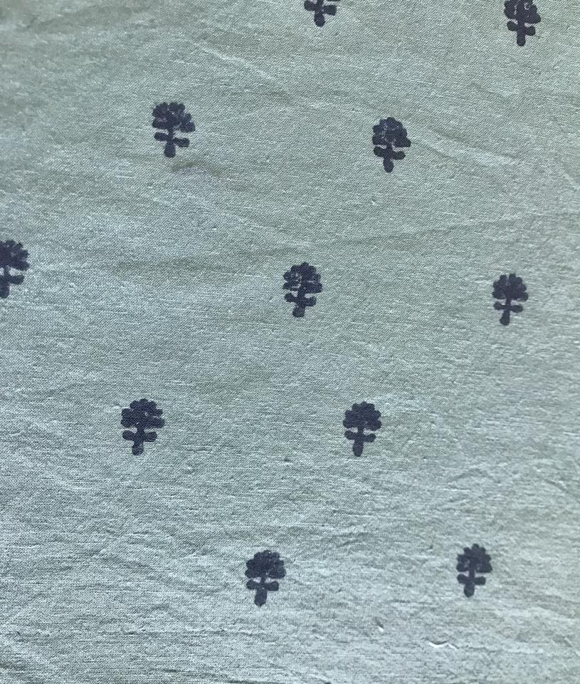 ผ้าฝ้ายพิมพ์ลายด้วยมือ ลายดอกไม้แบบมินิมอล ดีไซน์บูติ | ผ้าสีเขียวเซจลายชนเผ่าอินเดีย