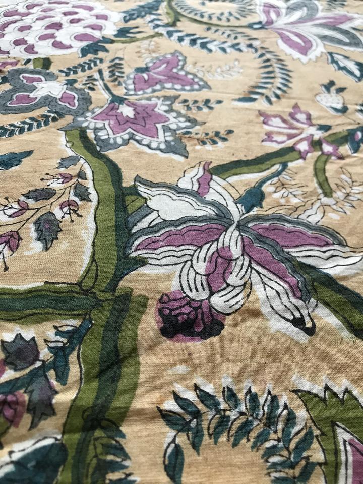 ผ้าฝ้ายพิมพ์ลายด้วยมือ ลายดอกไม้แบบมุกฮาล ดีไซน์เถาวัลย์ พร้อมลวดลายหลากสีบนพื้นสีเบจ