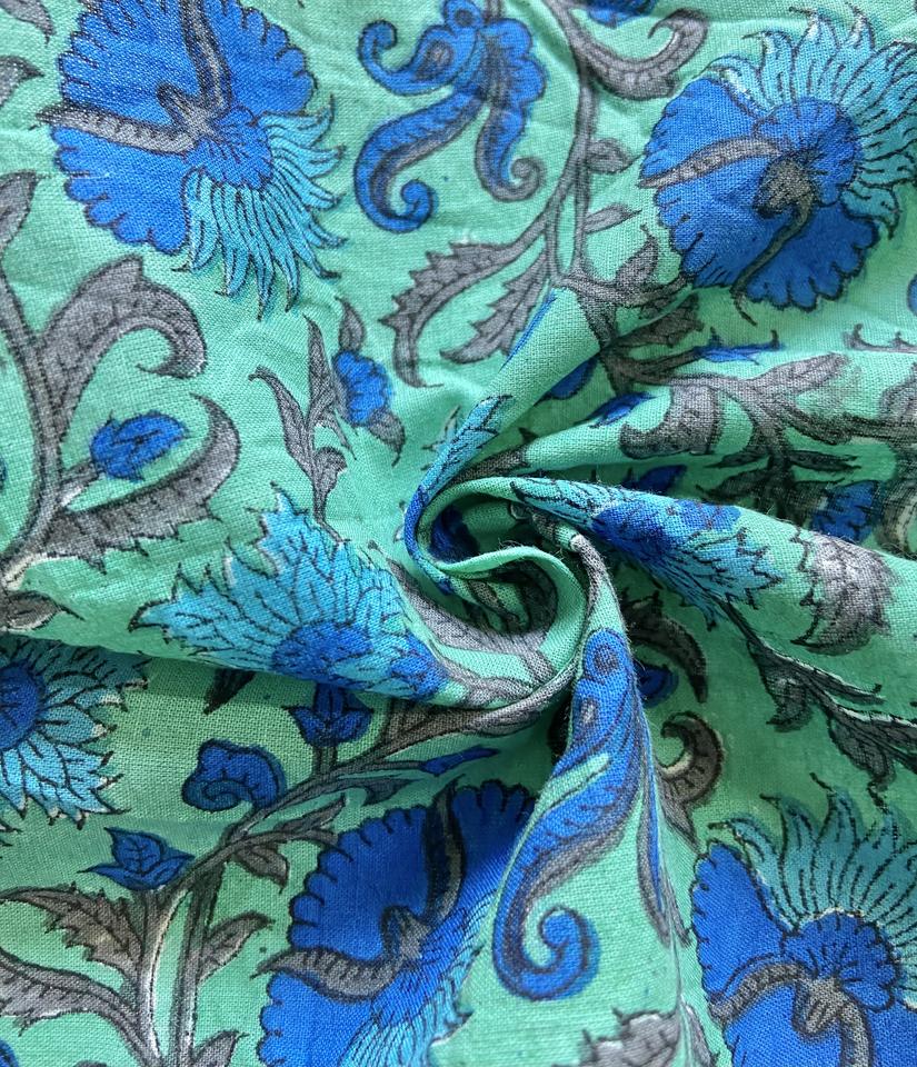 ผ้าฝ้ายพิมพ์ลายด้วยมือ ลายดอกไม้แบบมุกฮาล บนพื้นสีเขียวมิ้นท์