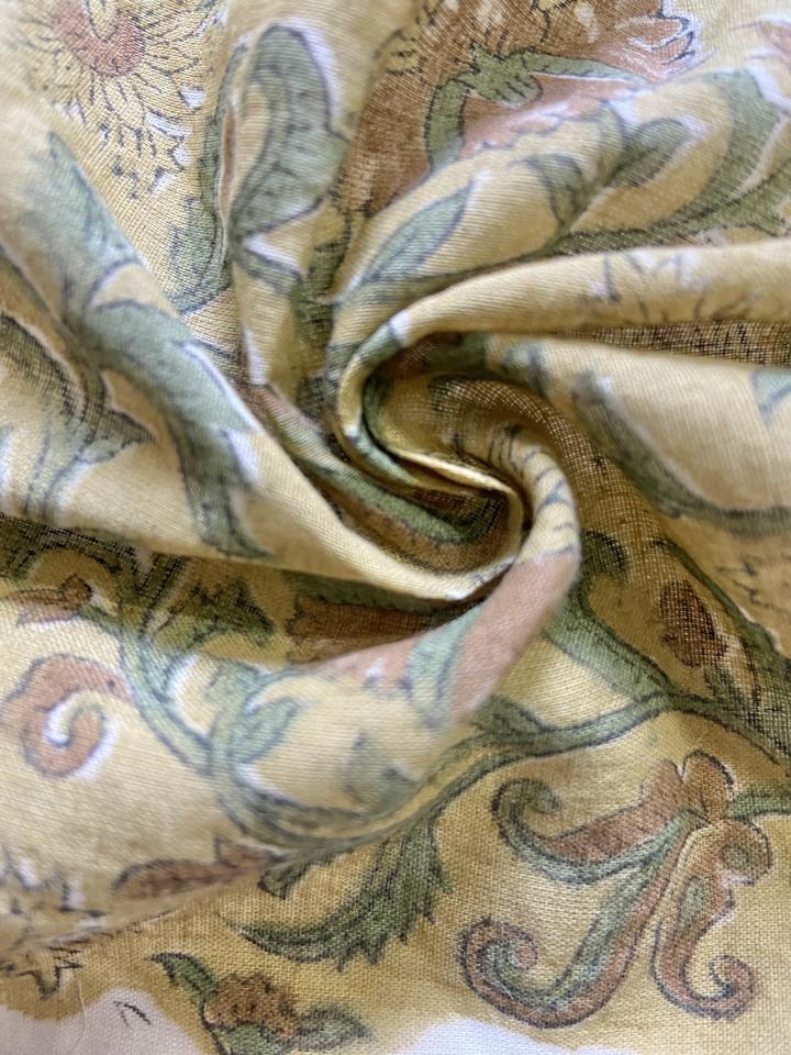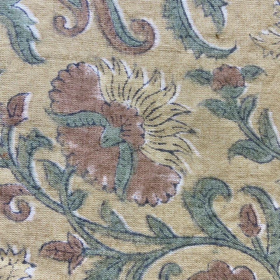ผ้าฝ้ายพิมพ์ลายด้วยมือ ลายดอกไม้แนววินเทจ บนพื้นสีมัสตาร์ด