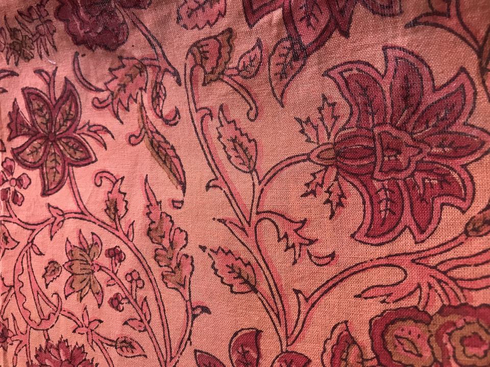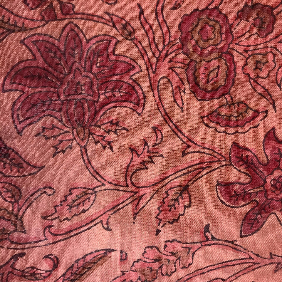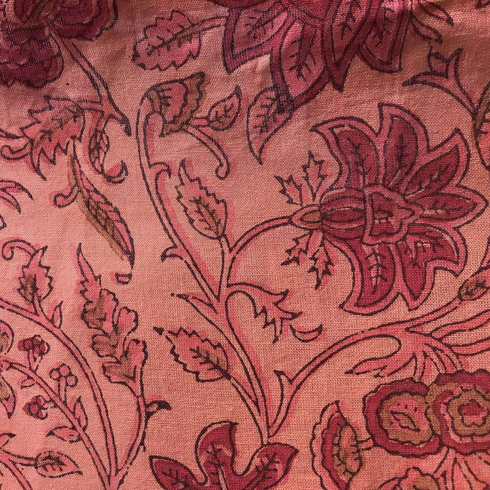 Hand Block Printed Cotton Fabric Peach Pink Base Floral Vine Pattern | Traditional Indian Kalamkari Style Print