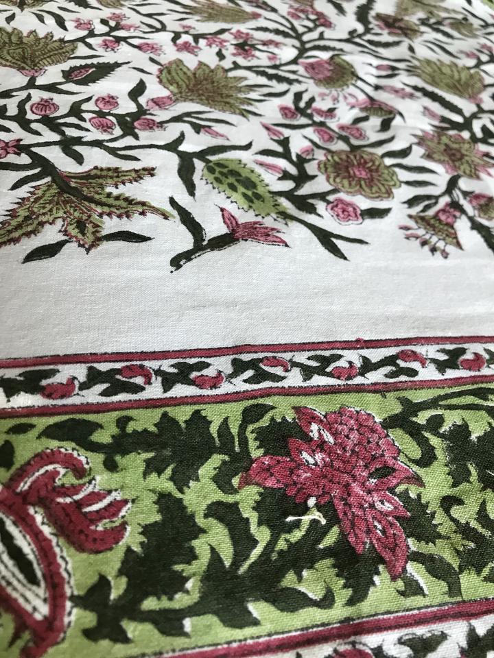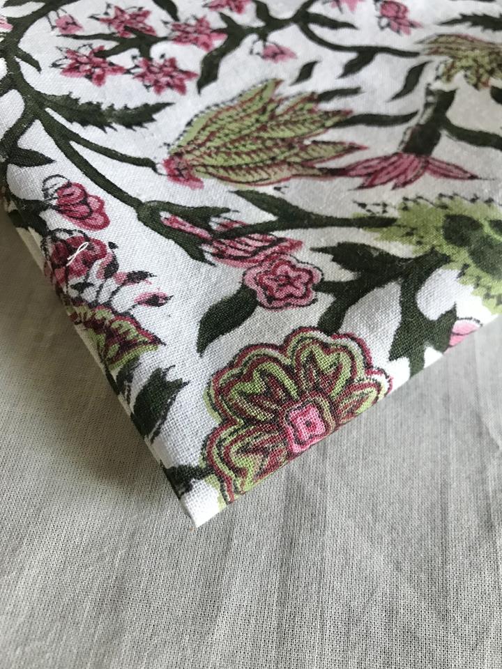 ผ้าฝ้ายพิมพ์ลายด้วยมือ พื้นขาว ลายดอกตูมสีชมพูและใบไม้สีเขียว