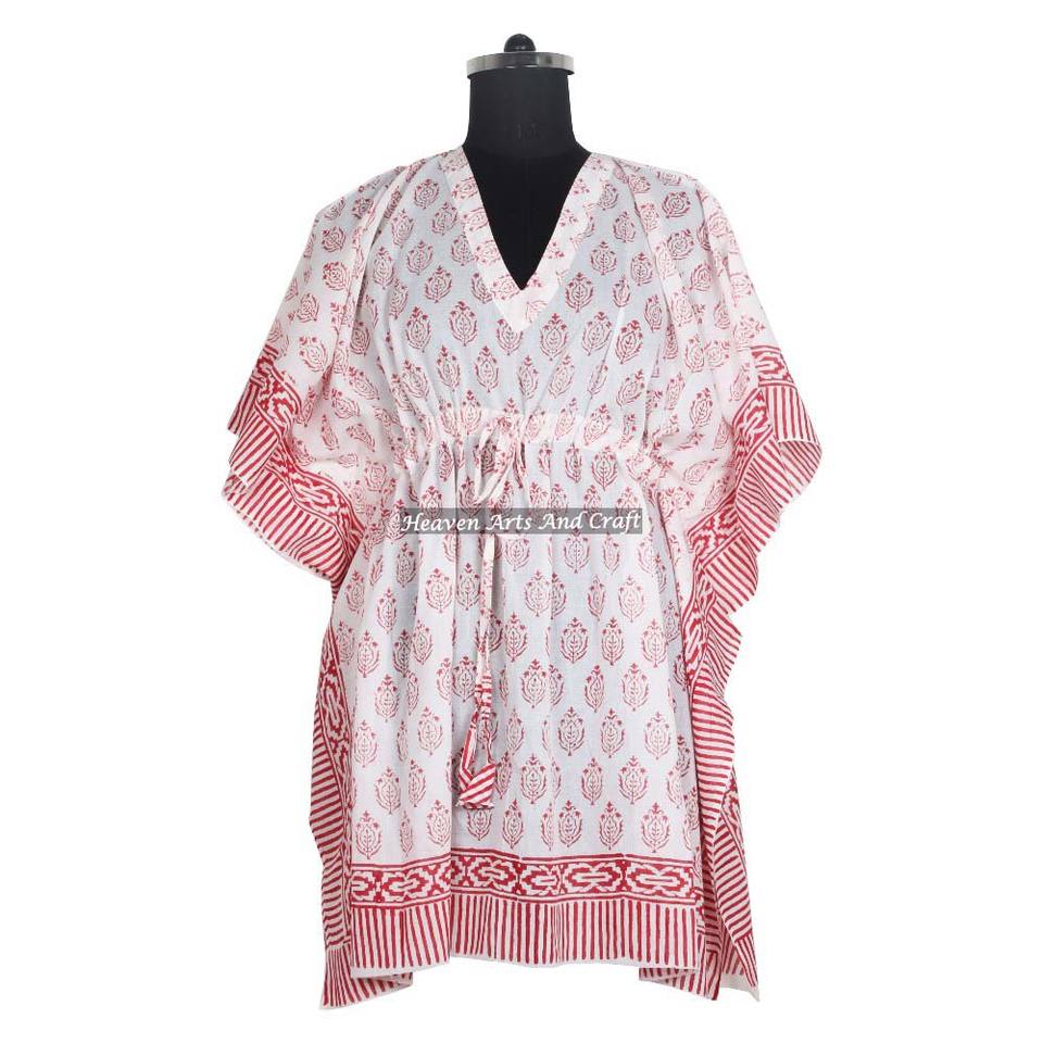 ชุดคาฟตันผ้าฝ้ายพิมพ์ลายด้วยมือ งานแฮนด์เมดสไตล์อินเดีย รุ่น KFCS019 ดีไซน์แม็กซี่ แขนสั้น ไซส์ XL สไตล์แฟชั่นดูไบ