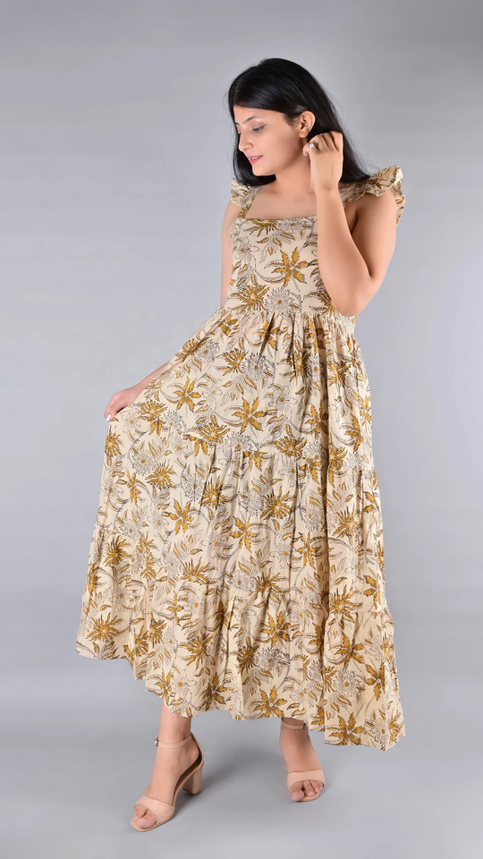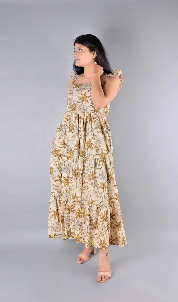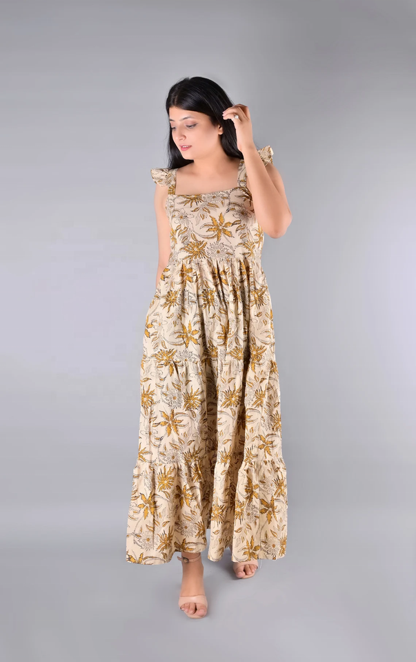 ชุดเดรสยาวผ้าฝ้ายพิมพ์ลายด้วยมือ สีพื้น สไตล์ฮิปปี้ ยั่งยืน สำหรับฤดูใบไม้ร่วง/ฤดูร้อน ลายดอกไม้