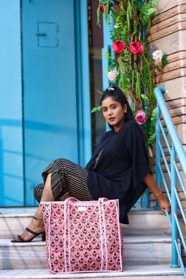 กระเป๋าผ้าคอตตอนพิมพ์ลายแฮนด์เมด, กระเป๋าโท้ทใส่ของพกพาความจุขนาดใหญ่เป็นมิตรกับสิ่งแวดล้อมดีไซน์ลายดอกไม้พีช
