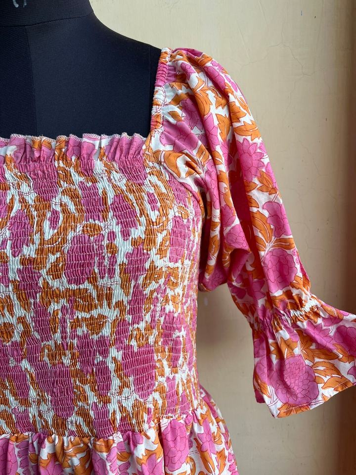 ชุดเดรสพิมพ์ลายด้วยมือแบบอินเดีย เสื้อคลุมอินเดีย ชุดเดรสยาวผ้าฝ้ายอินเดีย ชุดเดรสผ้าฝ้ายอินเดีย คอเหลี่ยม ลายดอกไม้ ชุดเดรสยาวแม็กซี่