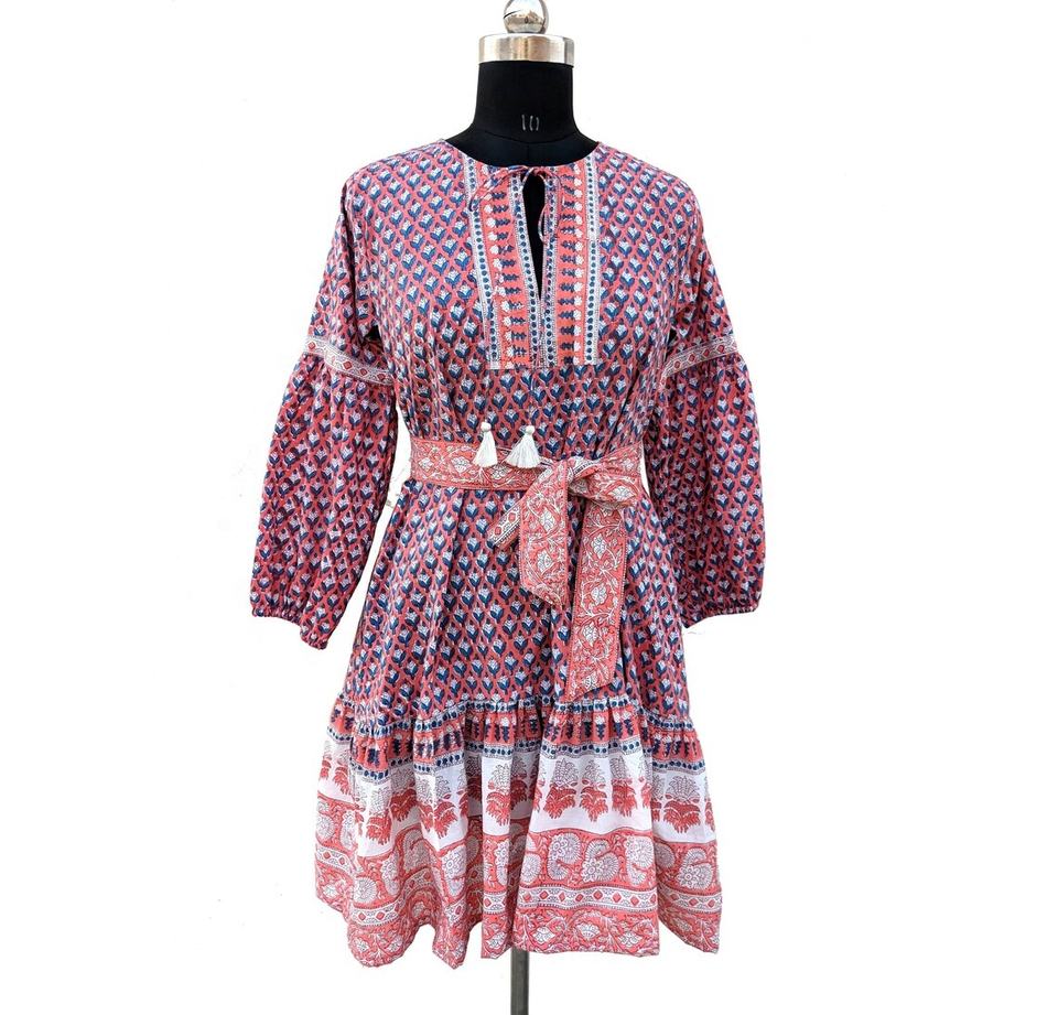 ชุดเดรสพิมพ์ลายด้วยมือ ชุดเดรสยาวปานกลางสำหรับฤดูร้อน ชุดเดรสทำมือพร้อมกระเป๋าและเข็มขัด ชุดเดรสลำลองสำหรับผู้หญิง ของขวัญสำหรับเธอ