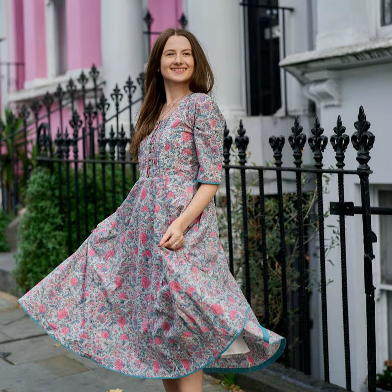 ชุดเดรสฮันน์พิมพ์ลายด้วยมือ สไตล์โบฮีเมียน ความยาวระดับน่อง ลายดอกไม้ สีเทาชมพู ลำลอง ใส่ได้หลายโอกาส ทำด้วยมือ แฟชั่นที่เป็นมิตรต่อสังคม แบบต่อผ้า