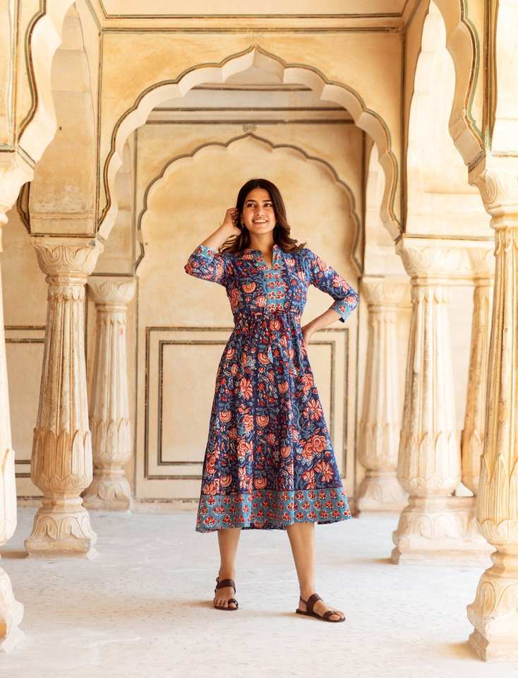 ชุดเดรสลายพิมพ์บล็อกแฮนด์เมดสไตล์โบฮีเมียน ผ้าฝ้าย ชุดลำลองสำหรับใส่ในโอกาสต่างๆ ช่วงฤดูร้อนและวันหยุดสำหรับผู้หญิง