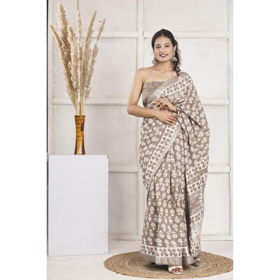 ผ้าซารีผ้าลินินผสมฝ้ายพิมพ์ลายด้วยมือ คอเสื้อแบบไร้สาย ระบายอากาศได้ดี ด้วยเทคนิคการพิมพ์ลายด้วยมือ