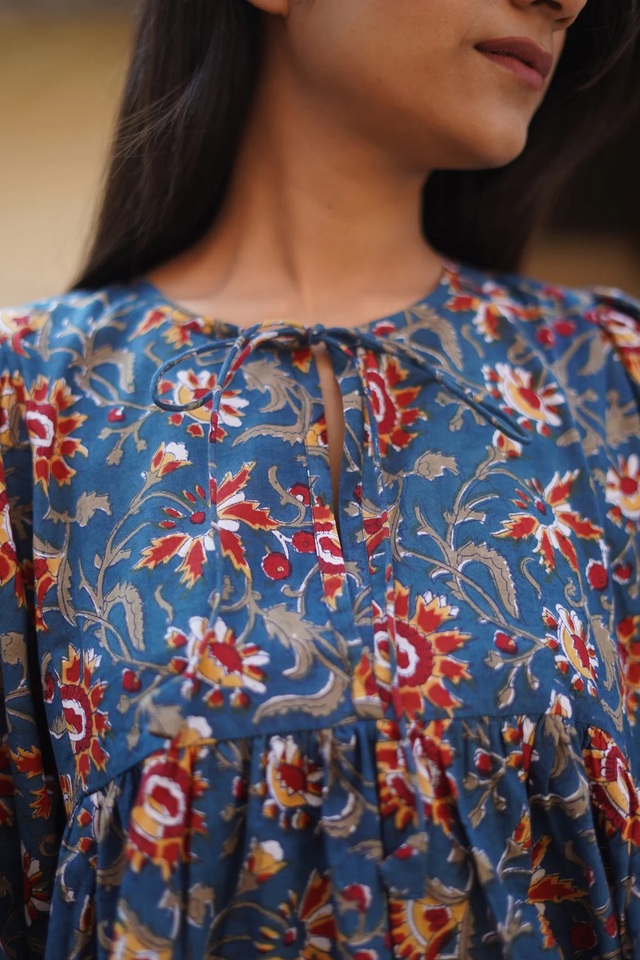 ชุดเดรสยาวพิมพ์ลายด้วยมือสำหรับฤดูร้อน ผ้าฝ้ายลายดอกไม้ ทำด้วยมืออย่างยั่งยืนสำหรับฤดูใบไม้ร่วง