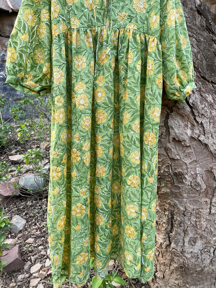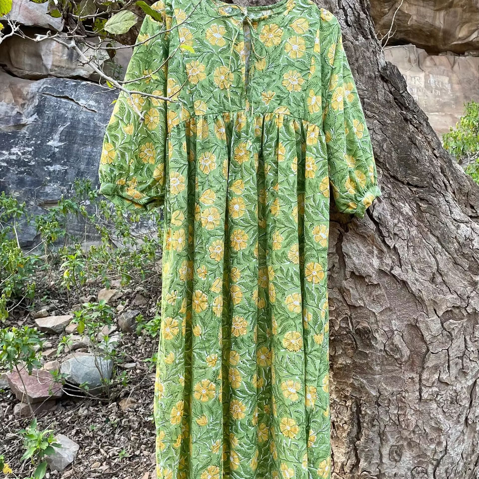 Hand Block Printed Maxi Dress for Summer Floral Cotton Handmade Sustainable for Autumn