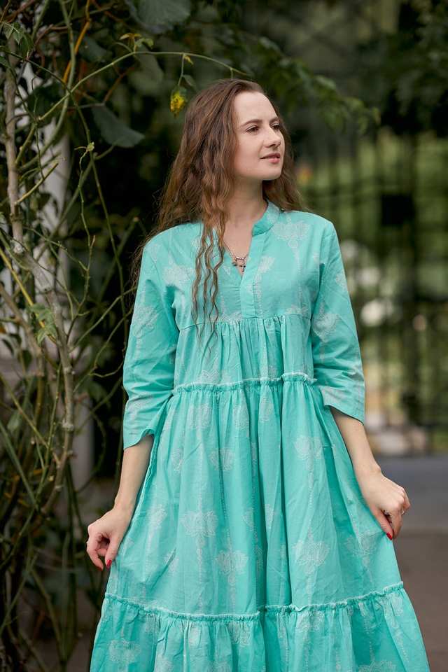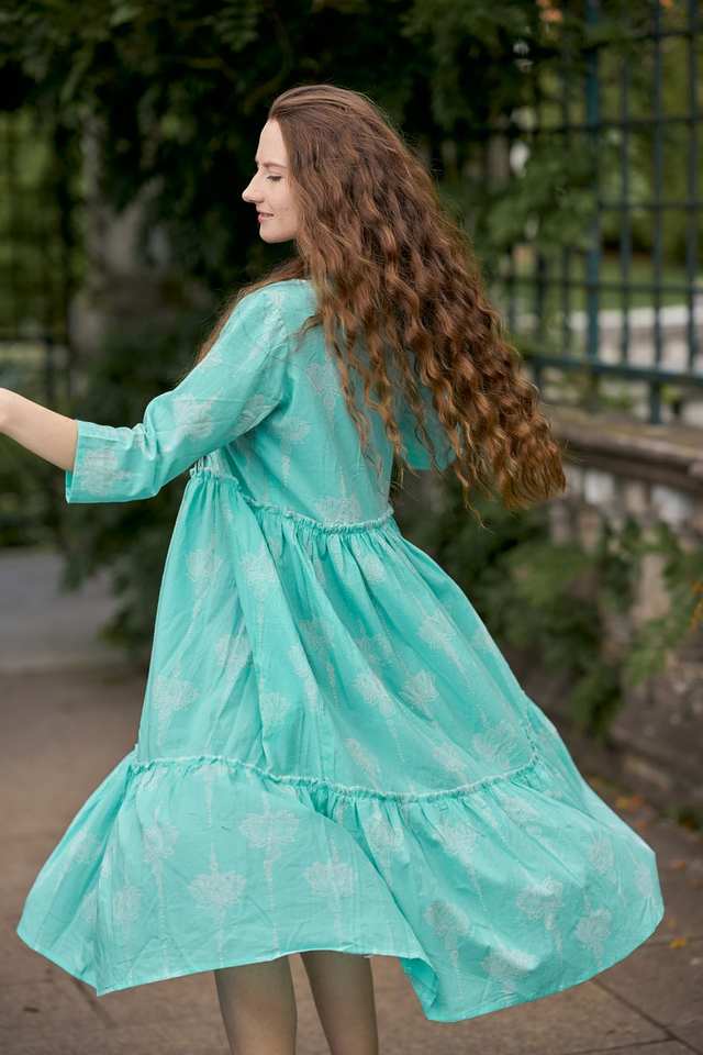 ชุดเดรสมิยะพิมพ์ลายด้วยมือ ผ้าฝ้ายแท้ ลายดอกไม้สไตล์โบฮีเมียน ลำลอง ใส่ได้หลายโอกาส ทำด้วยมือ แฟชั่นที่เป็นมิตรต่อสังคม สีเทอร์ควอยซ์ขาว