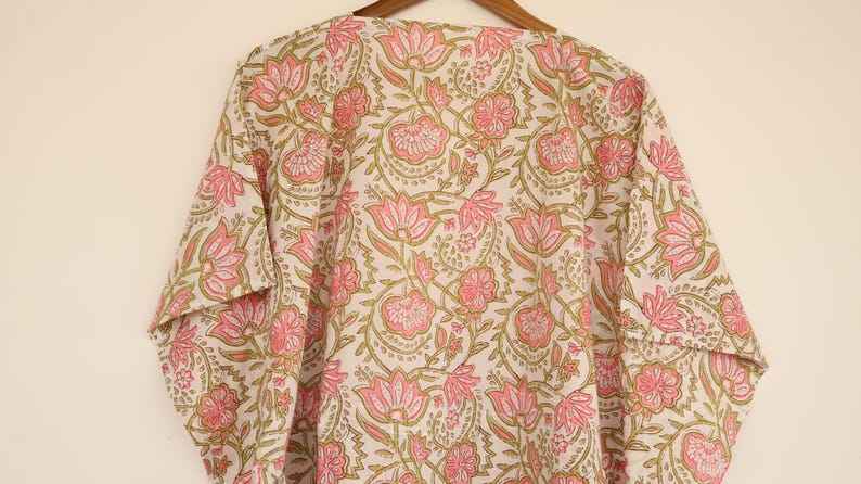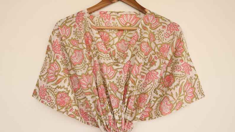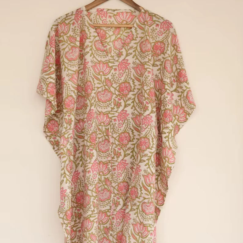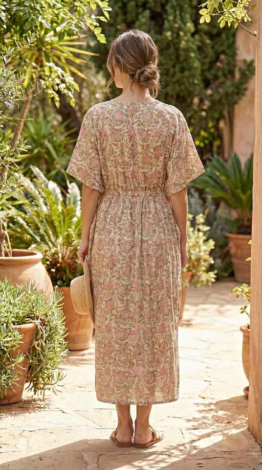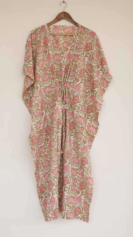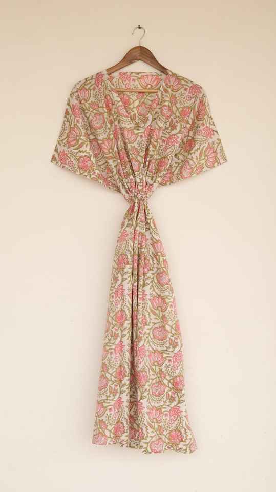 ชุดเดรสผ้าฝ้ายพิมพ์ลายดอกไม้สีชมพูแบบแฮนด์บล็อกพร้อมเชือกรูดที่เอว