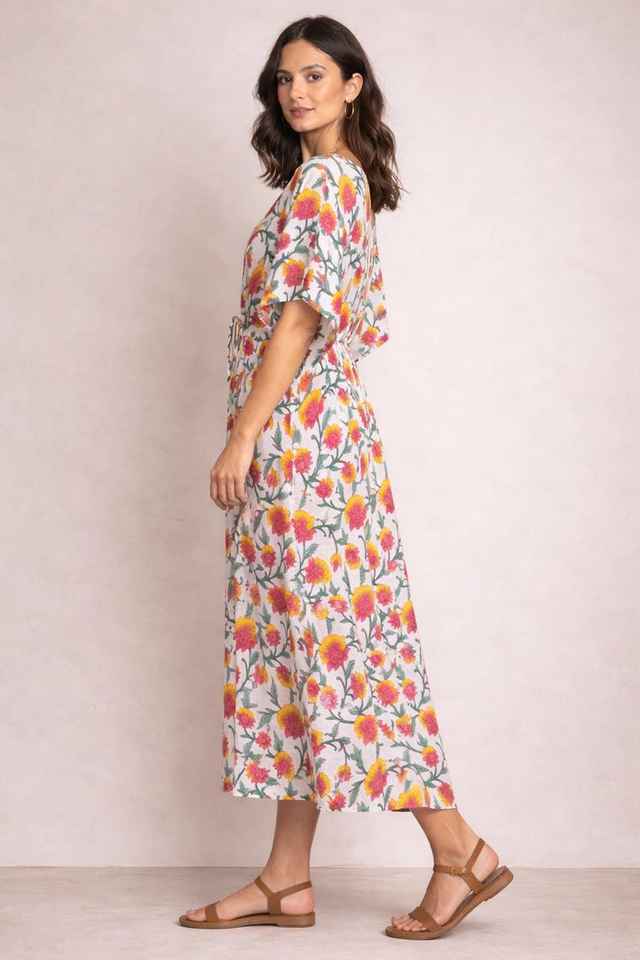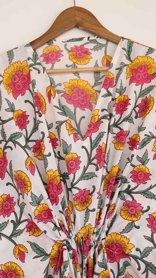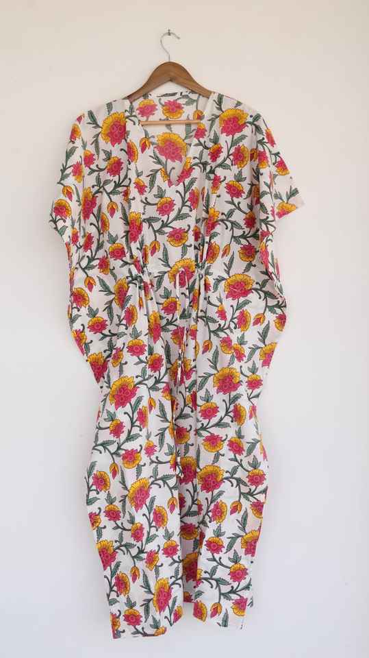 ชุดเดรสผ้าฝ้ายพิมพ์ลายด้วยมือ สีชมพูเหลือง สไตล์คาฟตัน ใส่สบายในฤดูร้อน