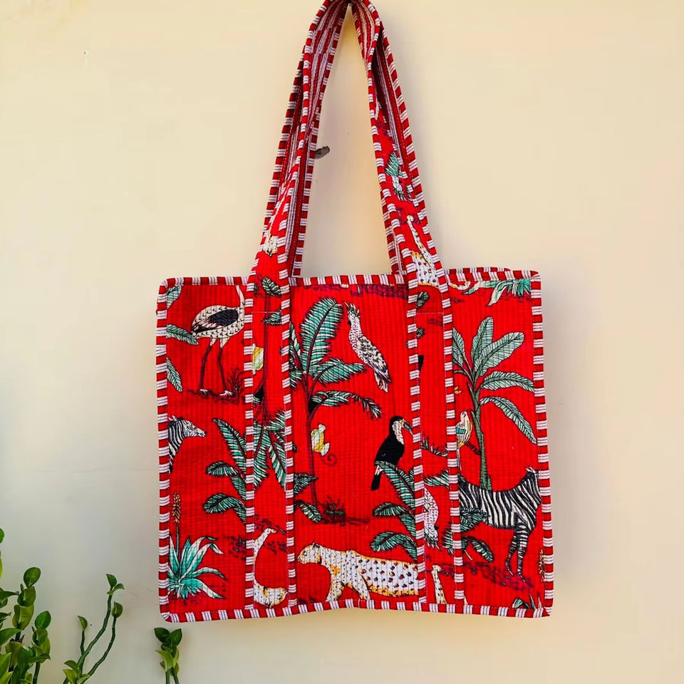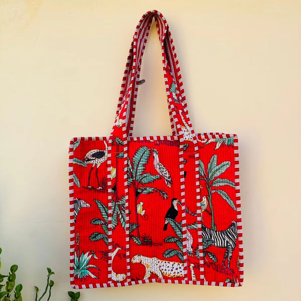 กระเป๋าช้อปปิงผ้าคอตตอนบุผ้าคอตตอนพิมพ์ลายดอกไม้หลากสีสายคล้องไหล่สองข้างสำหรับชายหาดในฤดูร้อน