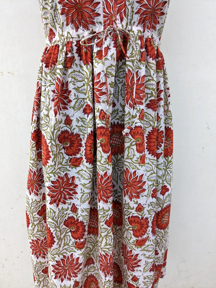 ชุดเดรสผ้าฝ้ายพิมพ์ลายด้วยมือสำหรับฤดูร้อน | ลายดอกไม้ | ชุดเดรสยาวลำลองคอวีแขนกุดทำมือสำหรับผู้หญิง