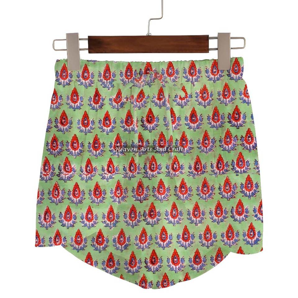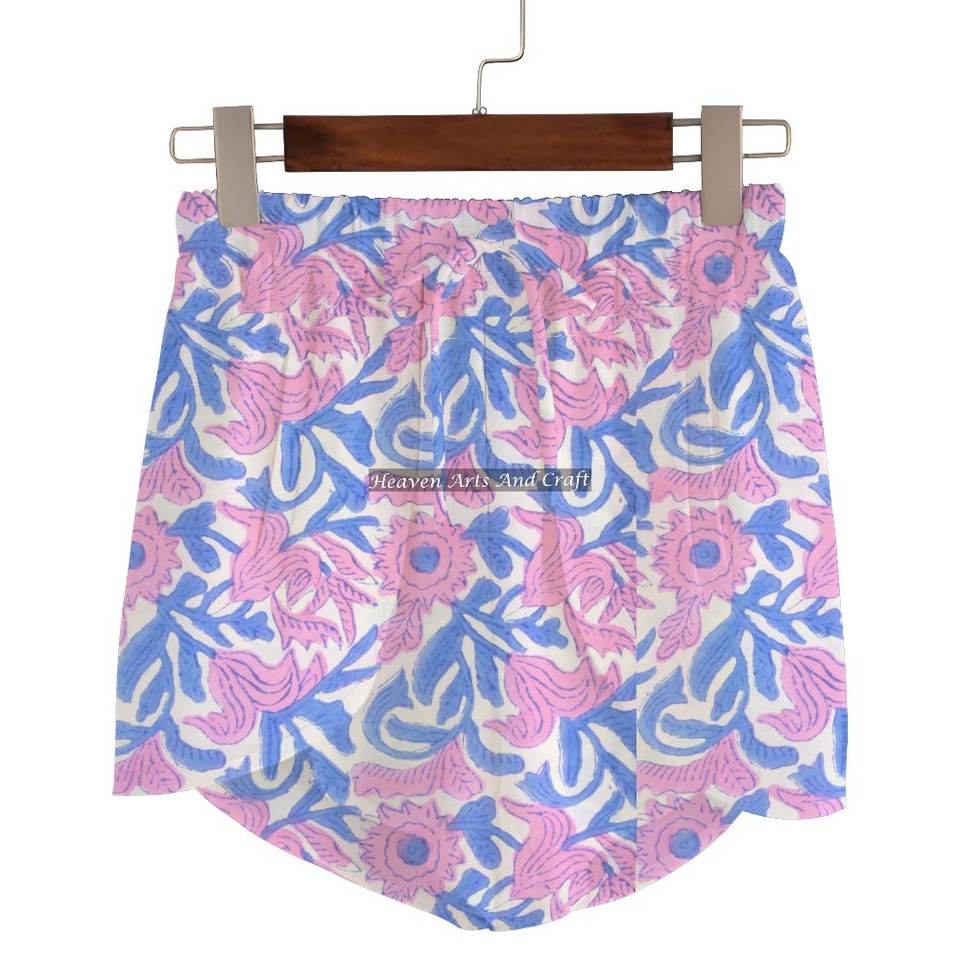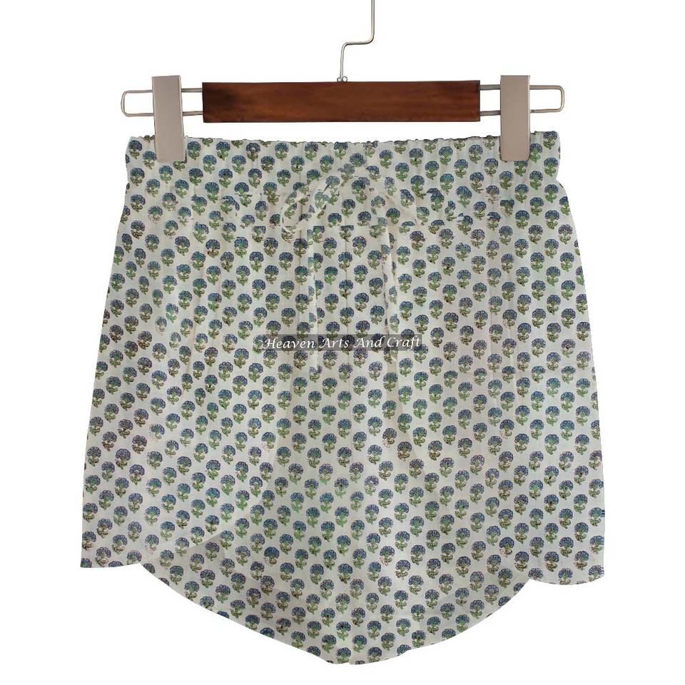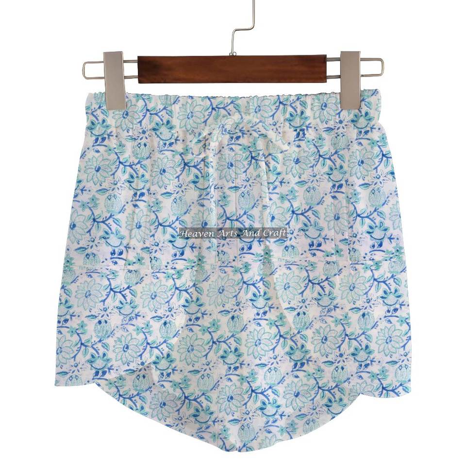 กางเกงขาสั้นพิมพ์ลายบล็อกด้วยมือ ชุดลำลองฤดูร้อนสำหรับผู้หญิง กางเกงขาสั้นพิมพ์ลายบล็อกผ้าฝ้าย คอลเลคชั่นสาวๆ ไปทะเล สไตล์เบบี้ดอล