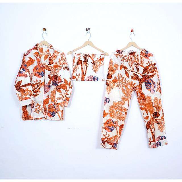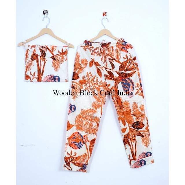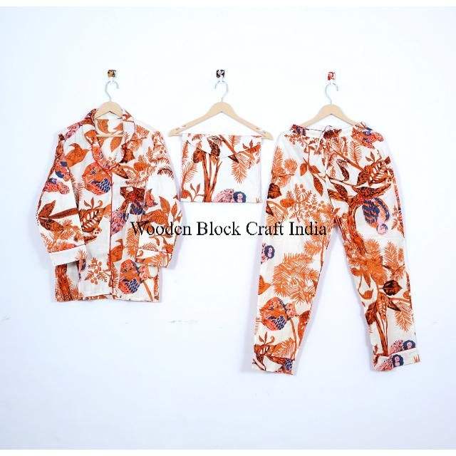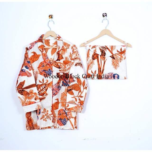 ชุดนอนผ้าฝ้ายพิมพ์ลายทรอปิคอลแบบแฮนด์บล็อกสำหรับผู้หญิง ชุดนอนนุ่มสบายสำหรับฤดูหนาว ของขวัญสุดเพอร์เฟกต์สำหรับผู้หญิง