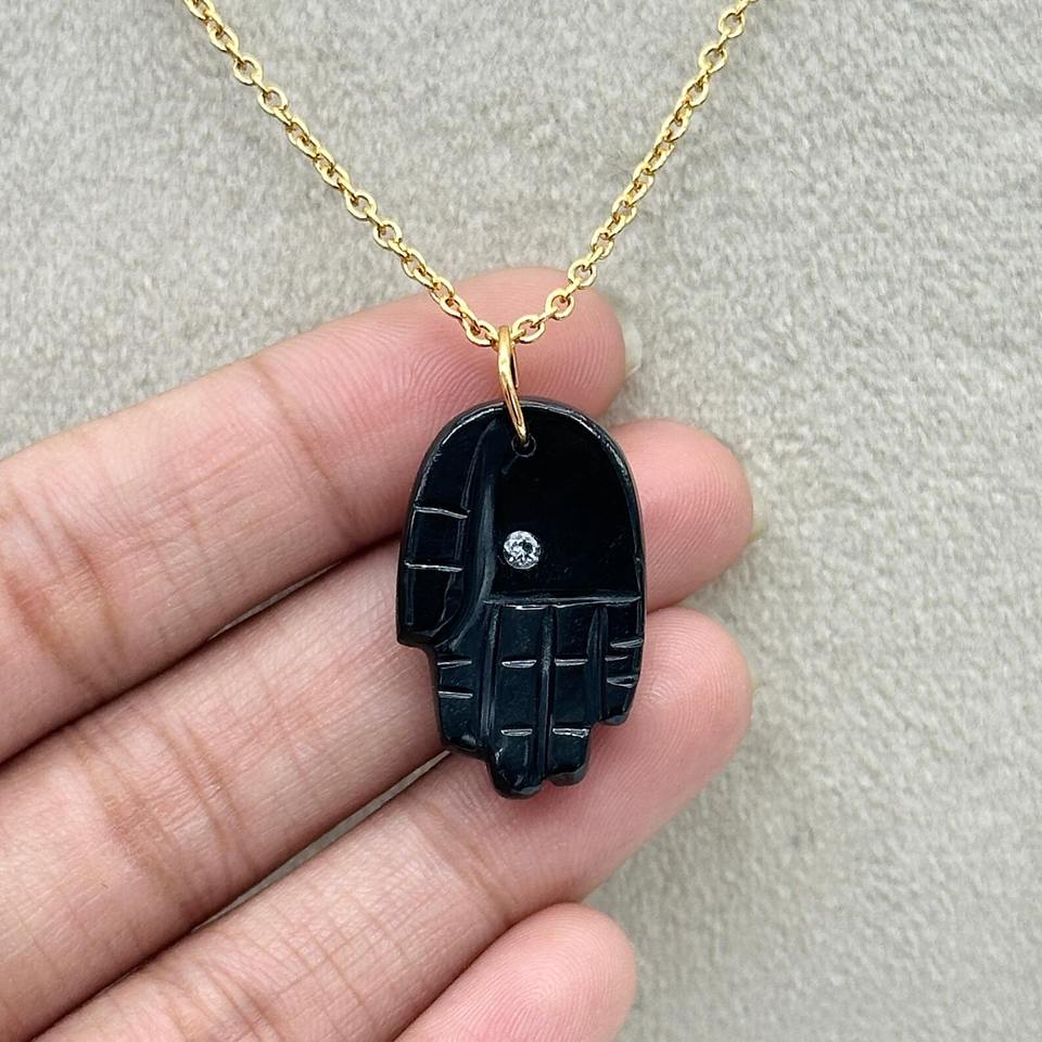 จี้โอนิกซ์แฮมซาสีดำแกะสลักด้วยมือขนาด20x12มม. พร้อมห่วงชุบทองตรงกลางทรงลูกบาศก์เซอร์โคเนียเครื่องรางป้องกันสำหรับการทำเครื่องประดับ