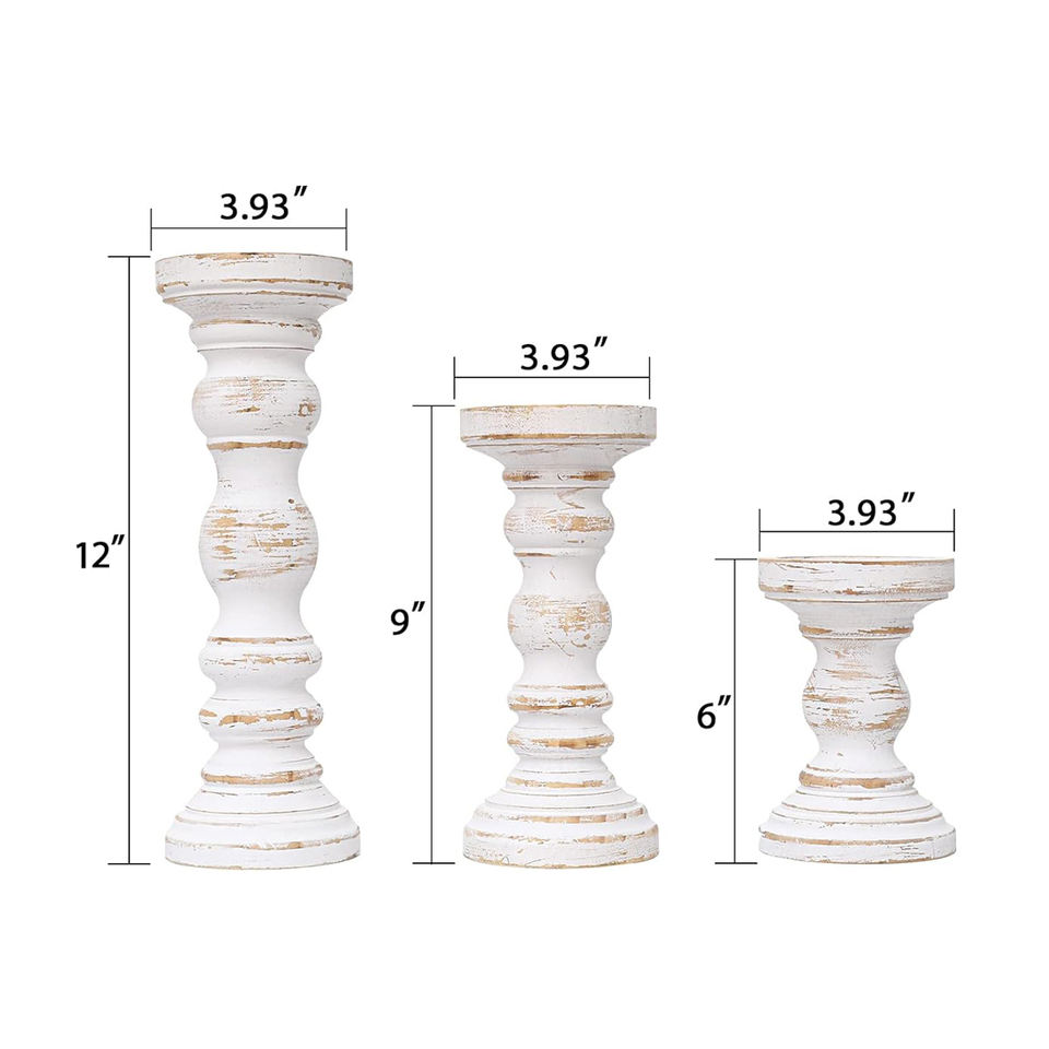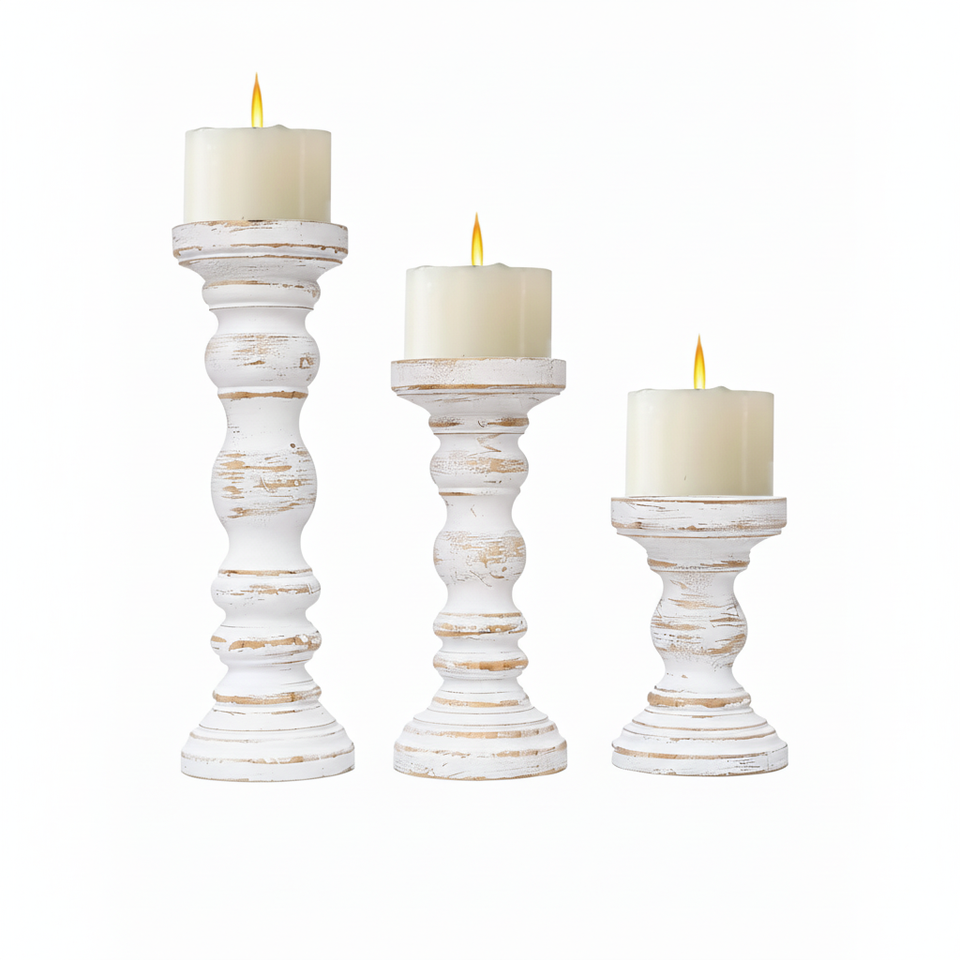 Premium Hand Carved Mango Wood Pillar Candle Holder Set of 3 Rustic White Decorative Wooden Tabletop Candle Stands Cheap Price