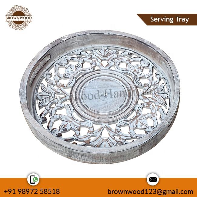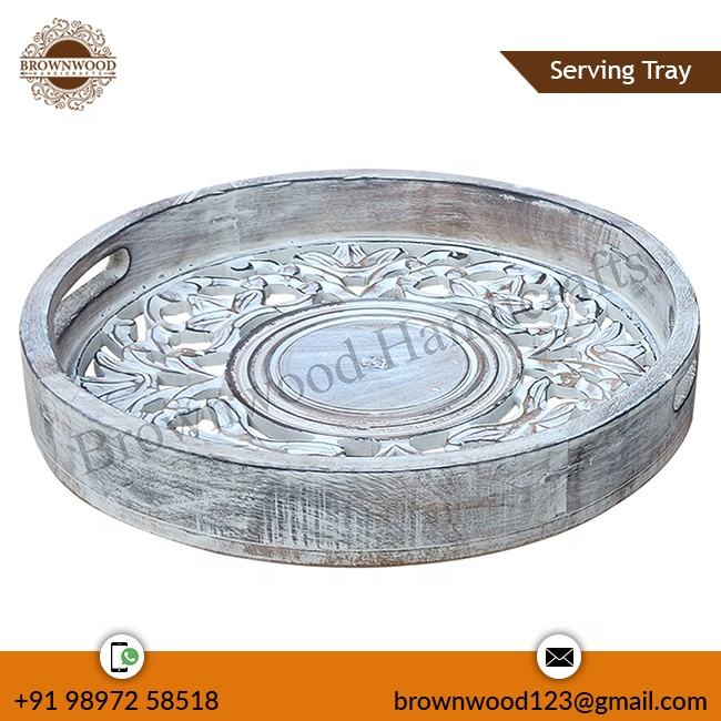 ถาดไม้มะม่วงแกะสลักด้วยมือทรงกลมดีไซน์ทันสมัยถาดไม้สำหรับตกแต่งอาหารสำหรับโรงแรมและร้านอาหารส่งออก