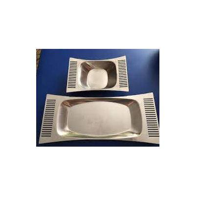 ถาดสแตนเลสสำหรับเสิร์ฟเครื่องดื่มอาหารของโรงแรมทำมือแกะสลักด้วยมือถาดกลมทำจากสเตนเลสงานเสร็จจากธรรมชาติ