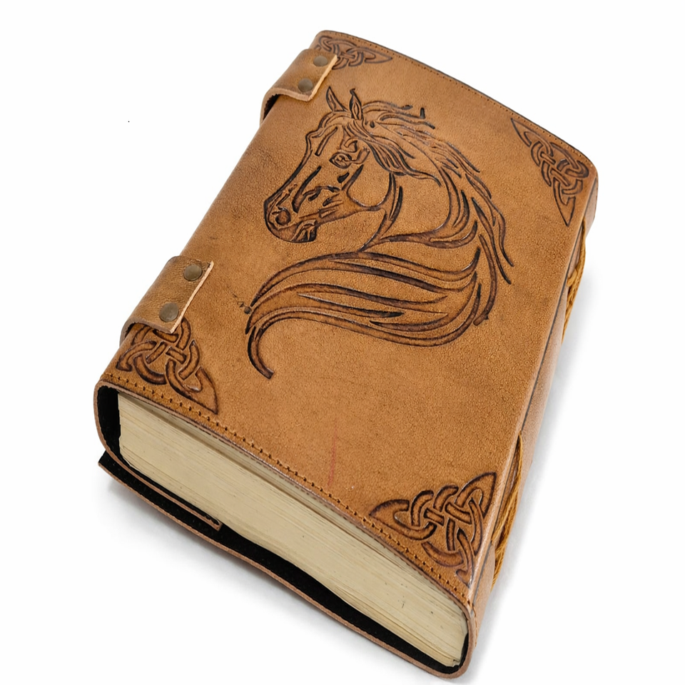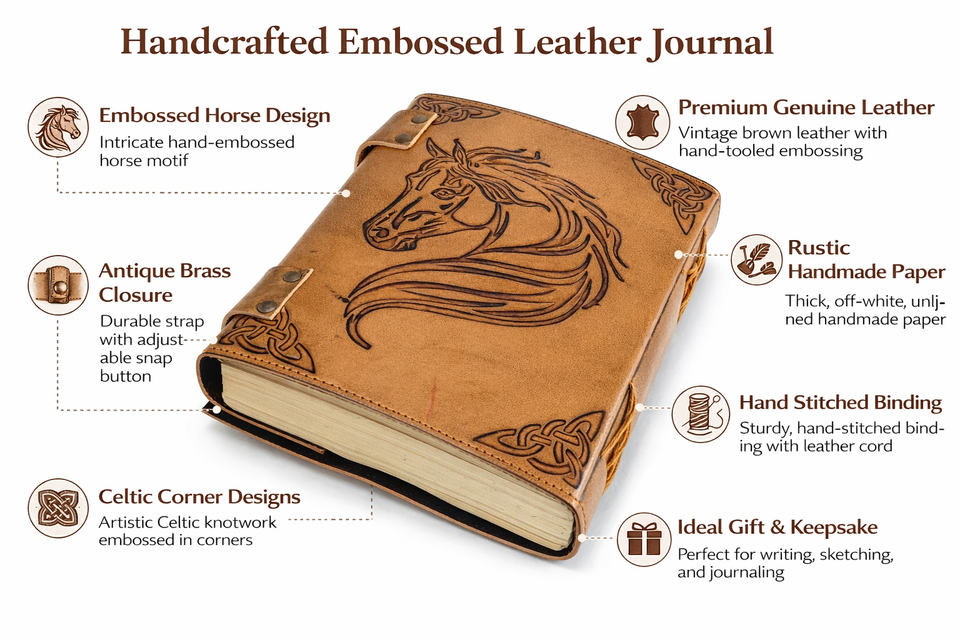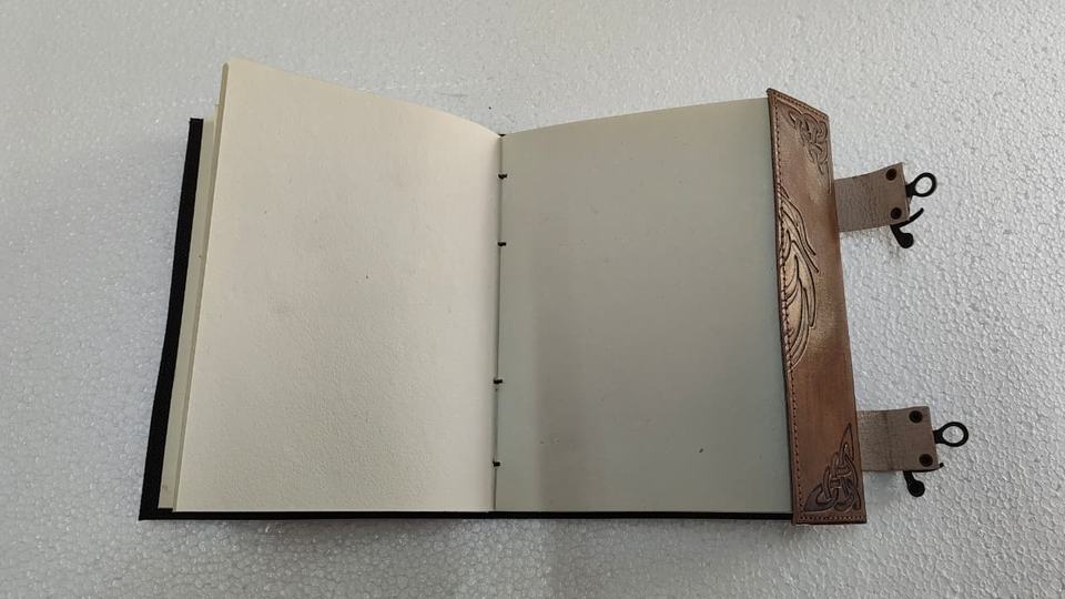 สมุดบันทึกหนังแท้ลายอักษรแบบคลาสสิก รักษ์โลก ปกสีน้ำตาลวินเทจ กระดาษทำมือ ปิดด้วยสายรัด