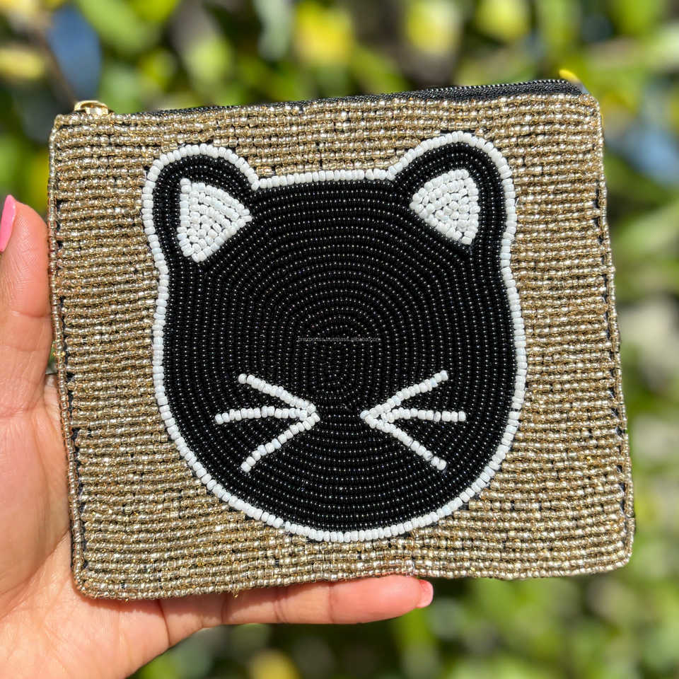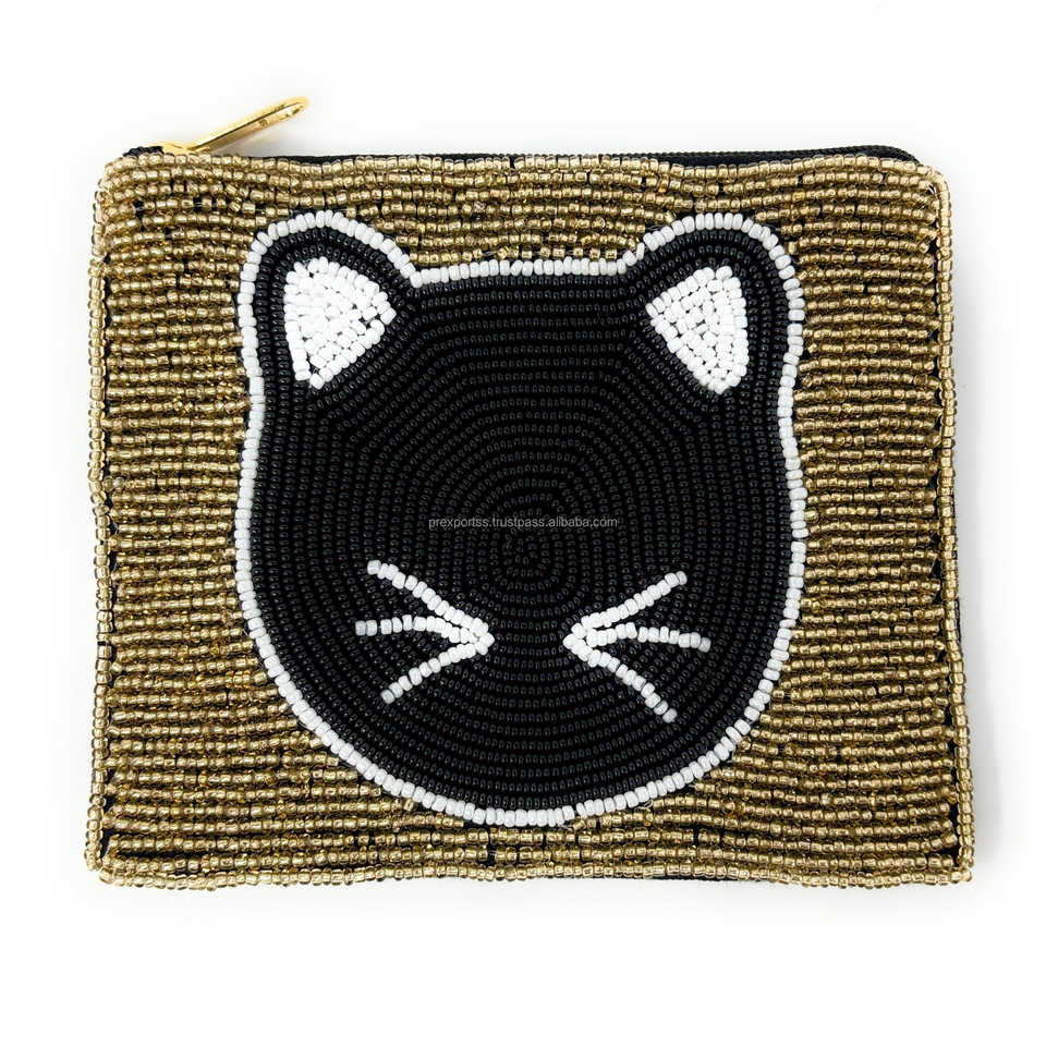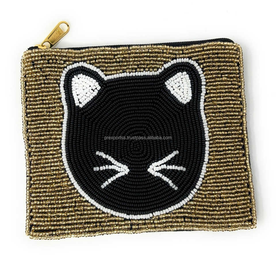 กระเป๋าสตางค์ใบเล็กปักลายหน้าแมวน่ารักสไตล์วินเทจ เป็นมิตรกับสิ่งแวดล้อม พร้อมซิปประดับลูกปัดสีทองดำ นุ่ม ซักได้ เหมาะสำหรับเป็นของขวัญ